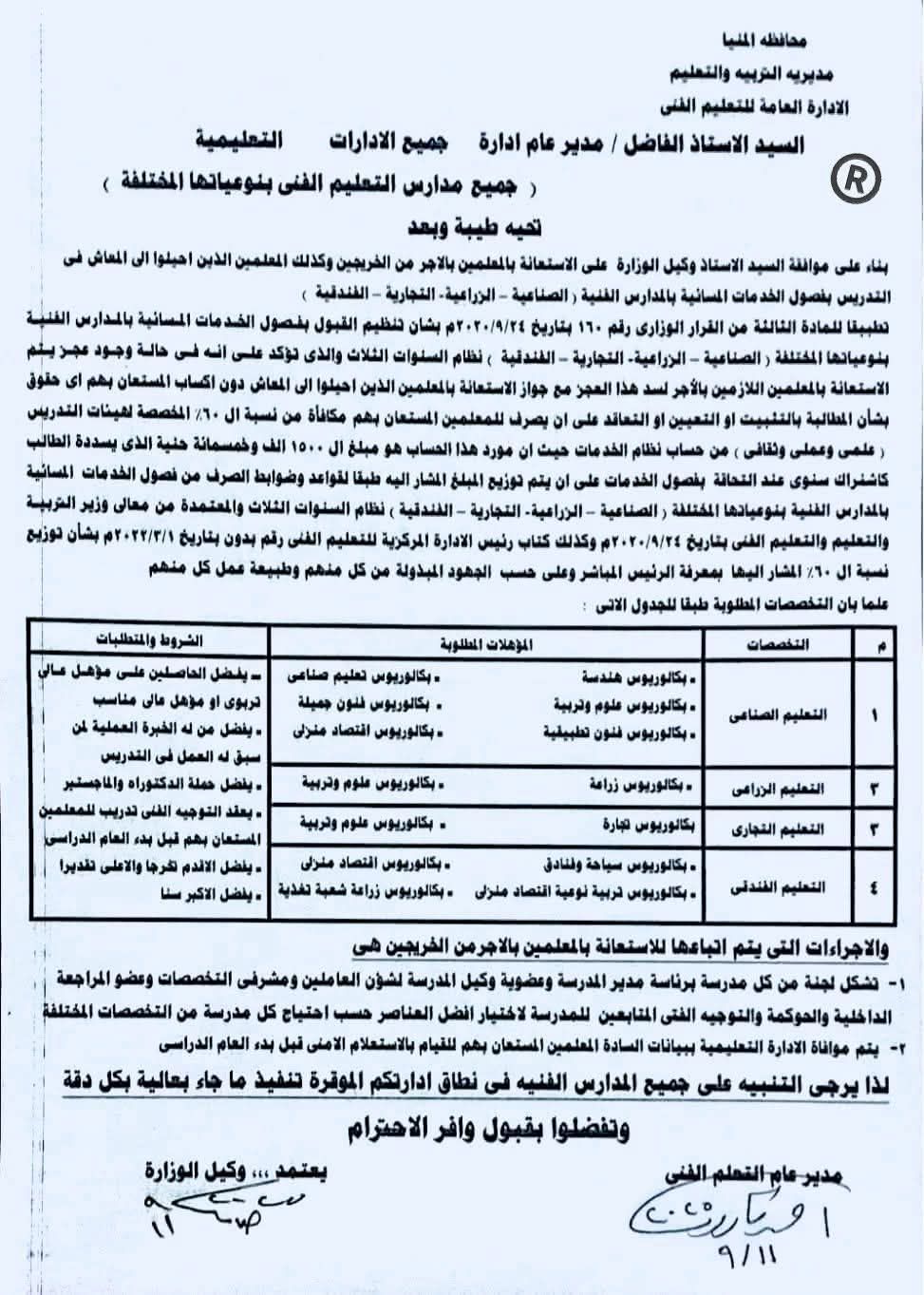 قررت مديرية التربية والتعليم والتعليم الفني بمحافظة المنيا، الاستعانة  بالمعلمين بالأجر من الخريجين وكذلك المعلمين الذين احيلوا إلى المعاش في التدريس بفصول الخدمات المسائية بالمدارس الفنية ( الصناعية - الزراعية - التجارية - الفندقية ).