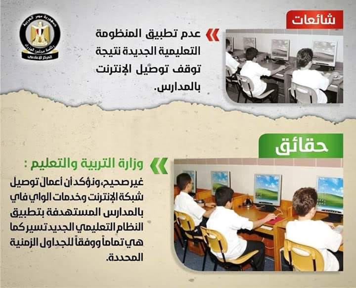 نفت وزارة التربية والتعليم والتعليم الفني ما تم تداوله على بعض صفحات مواقع التواصل الاجتماعي "فيس بوك" بشأن عدم تطبيق المنظومة التعليمية الجديدة نتيجة توقف توصيل الإنترنت بالمدارس.