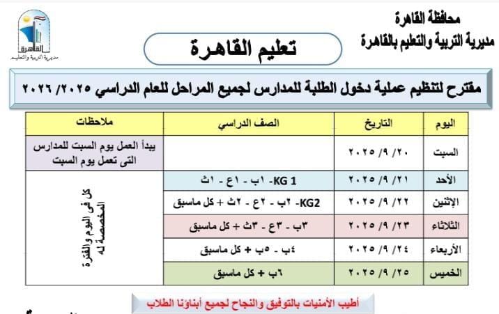 أعلنت مديرية التربية والتعليم والتعليم الفني بمحافظة القاهرة برعاية الدكتورة/ همت أبو كيلة مدير مديرية التربية والتعليم بالقاهرة، عن تنظيم عملية دخول الطلبة للمدارس لجميع المراحل التعليمية للعام الدراسي ٢٠٢٦/٢٠٢٥