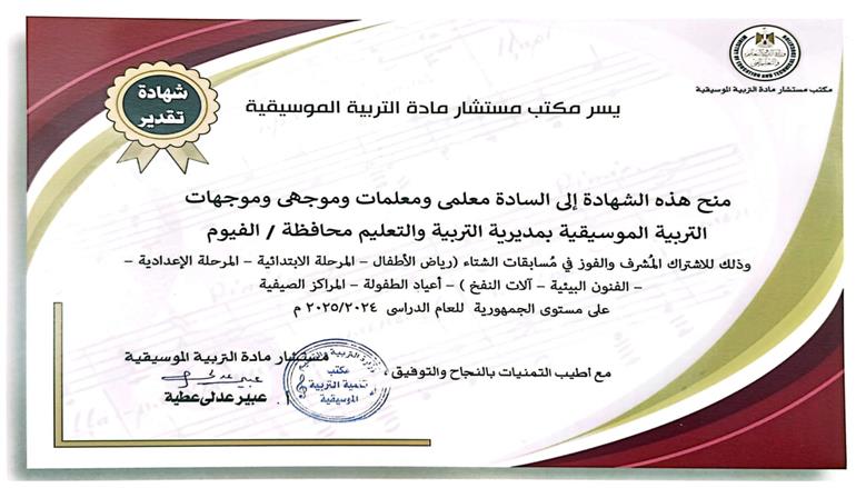 وكرّم مكتب مستشار التربية الموسيقية بوزارة التربية والتعليم فريق التربية الموسيقية بمديرية التربية والتعليم بالفيوم، تقديرًا لمشاركتهم المشرفة وفوزهم في مسابقات الشتاء، على مستوى الجمهورية للعام الدراسي 2025/2024، وذلك تحت إشراف ومتابعة الدكتور خالد خلف قبيصي وكيل وزارة التربية والتعليم بالفيوم، ورشا يوسف وكيل المديرية، ومحمد فتحي مدير عام التعليم العام.