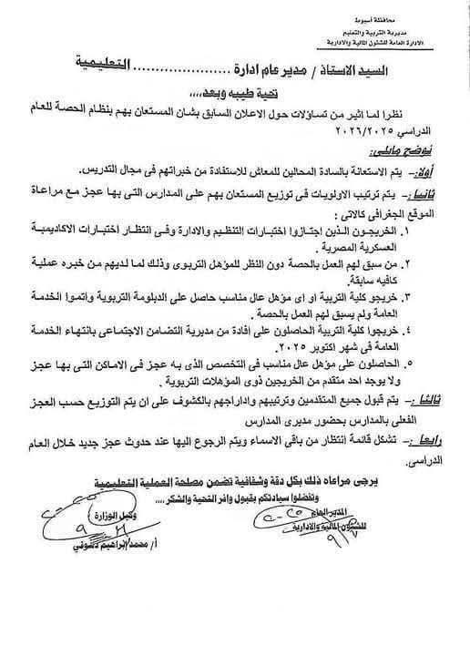 أوضحت مديرية التربية والتعليم والتعليم الفني بمحافظة أسيوط، أنه نظرا لما أثير من تساؤلات حول المستعان بهم بنظام الحصة للعام الدراسي ۲۰۲٦/٢٠٢٥، يتم مراعاة الآتي: