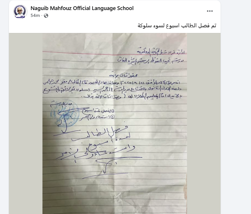وأوضحت إدارة مدرسة نجيب محفوظ الرسمية المتميزة للغات أن القرار يأتي في إطار الحفاظ على هيبة المؤسسة التعليمية، وترسيخ قيم الاحترام والانضباط بين الطلاب.