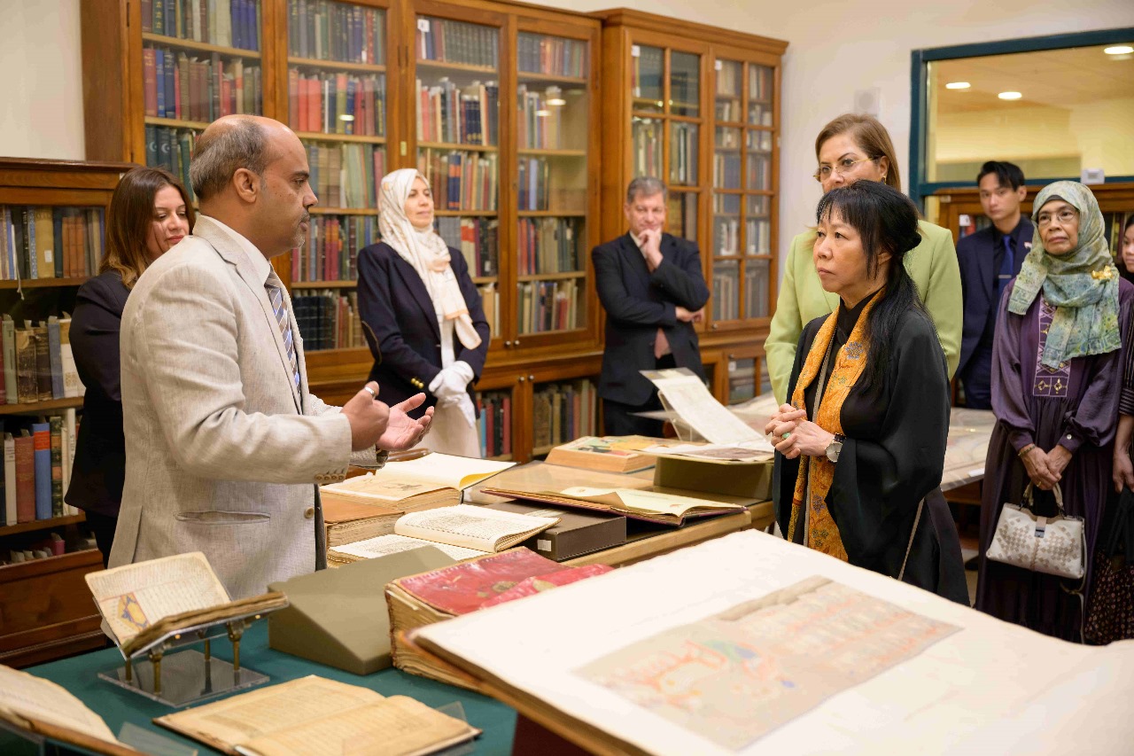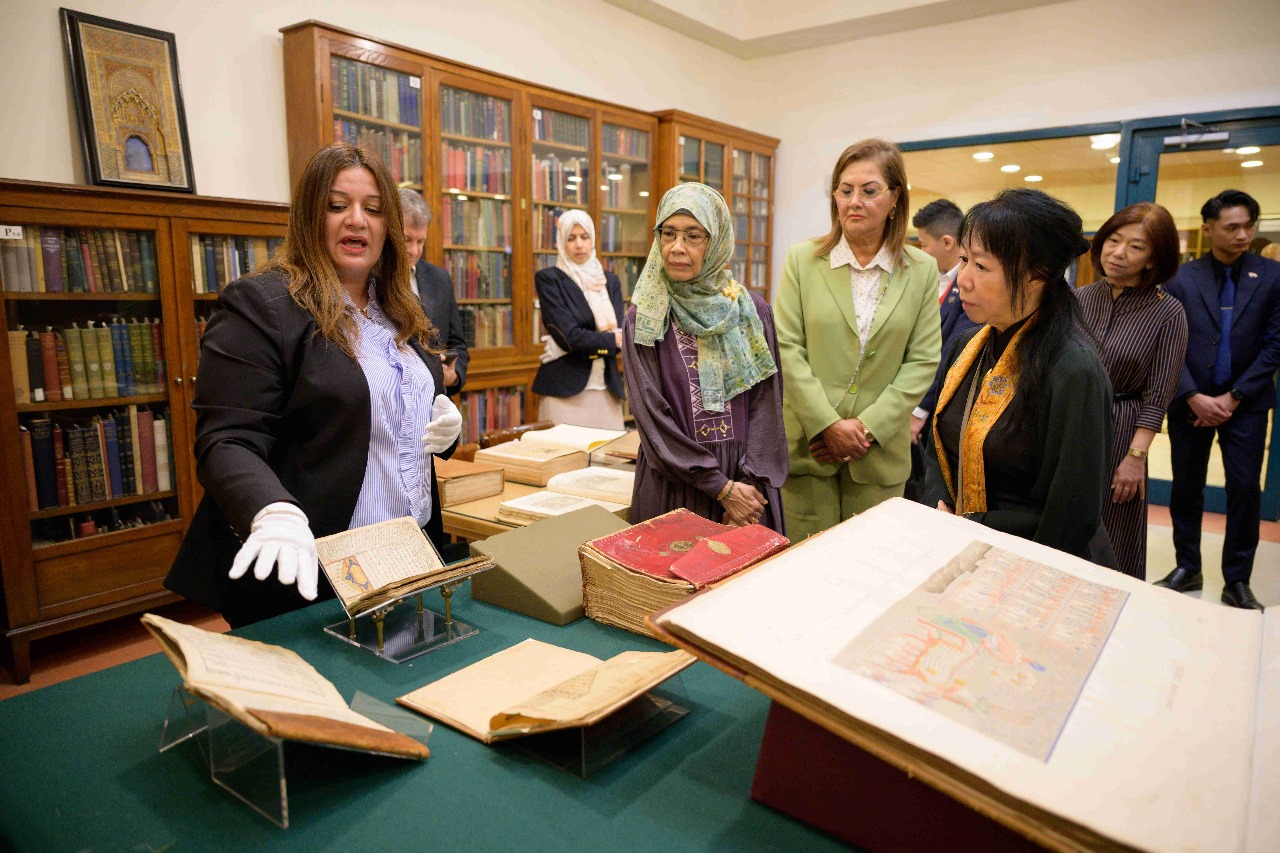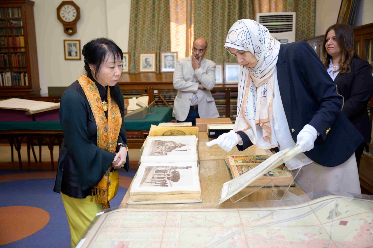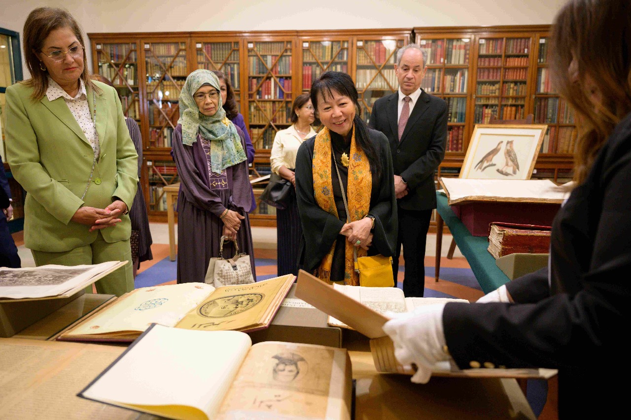 كما قام الوفد بجولة في قاعة كريزويل التي تضم مجموعة متميزة من المخطوطات العربية والكتب النادرة والمجلات التاريخية والخرائط والمواد الأرشيفية، حيث تعكس هذه المجموعات - التي توثّق الآثار والمواقع التاريخية في جميع أنحاء مصر - دور الجامعة الأمريكية بالقاهرة في احتضان المعرفة والتراث الثقافي، والحفاظ على الكنوز التي تخدم الأنشطة الأكاديمية والجمهور بصفة عامة.