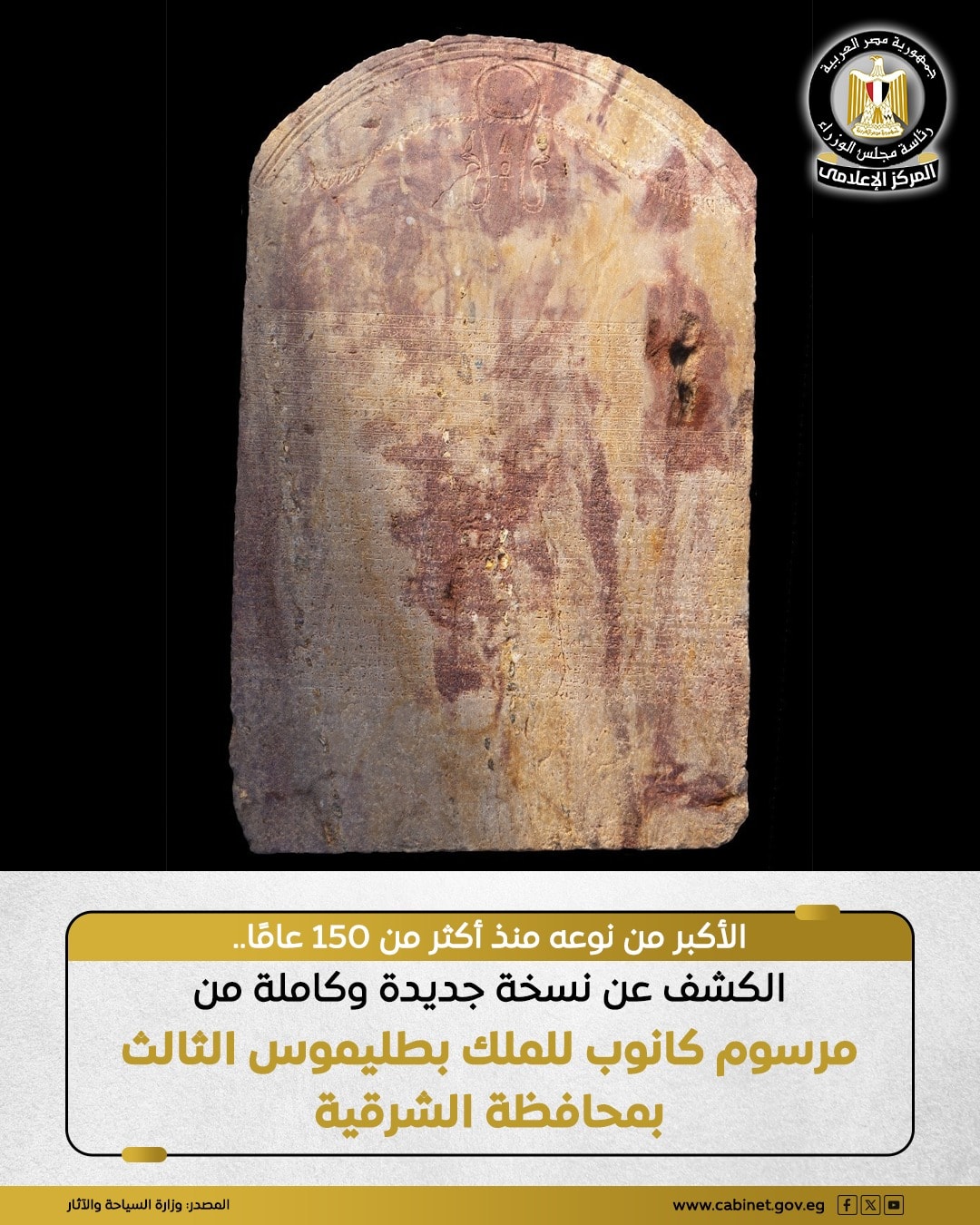 كشفت البعثة الأثرية المصرية التابعة للمجلس الأعلى للآثار والعاملة في موقع تل فرعون بمدينة الحسينية بمحافظة الشرقية، عن لوحة حجرية تمثل نسخة جديدة من مرسوم كانوب الشهير، الذي أصدره الملك بطليموس الثالث عام 283 ق.م، ويُعد هذا الكشف الأكبر من نوعه منذ أكثر من 150 عامًا، حيث لم يُعثر على نسخة جديدة وكاملة من المرسوم منذ ذلك الوقت.
