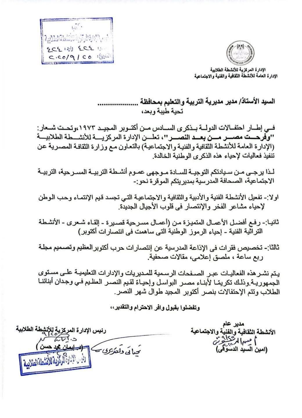 عممت وزارة التربية والتعليم والتعليم الفني، خطابا على المديريات التعليمية بشأن  احتفالات الدولة بذكرى السادس من أكتوبر المجيد ۱۹۷۳، وتحت شعار: " وفرحت مصر من بعد النصر".