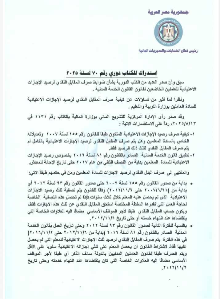 1. كيفية صرف رصيد الإجازات الاعتيادية المتكون طبقا للقانون رقم ١٥٥ لسنة ٢٠٠٧ وتعديلاته الخاص بالمعلمين وهل يتم صرف المقابل النقدي لرصيد الإجازات الاعتيادية بالكامل أم يتم صرف المقابل النقدي لثلث ذلك الرصيد فقط.