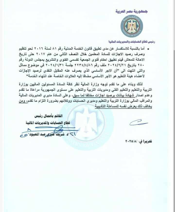 ووجهت  وزارة المالية نظر المسئولين الماليين بوزارة التربية والتعليم والتعليم الفني ومديريات التربية والتعليم على مستوى الجمهورية مراعاة ما تقدم وعدم إصدار شهادة بيانات برصيد إجازات مخالفا لما سبق، وعلى  مديري المديريات المالية والمراقب المالي بوزارة التربية والتعليم ومديري الحسابات ووكلائهم بضرورة التزام ما تقدم، ومن يخالف ذلك يعرض نفسه للمساءلة التأديبية