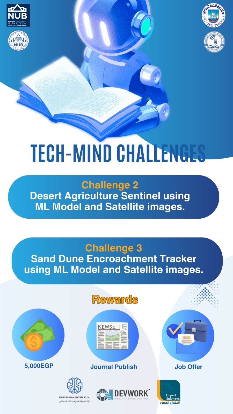 ويأتي التحدي الثاني بعنوان "Desert Agriculture Sentinel using ML Model and Satellite Images"، والذي يركز على مراقبة صحة المحاصيل والمياه في الزراعة الصحراوية باستخدام نماذج تعلم الآلة وصور الأقمار الصناعية، فيما يتناول التحدي الثالث "Sand Dune Encroachment Tracker using ML Model and Satellite Images" فكرة تتبع انتشار الكثبان الرملية للحماية من مخاطر التصحر بالاعتماد على تقنيات الذكاء الاصطناعي والتعلم العميق ومعالجة الصور.