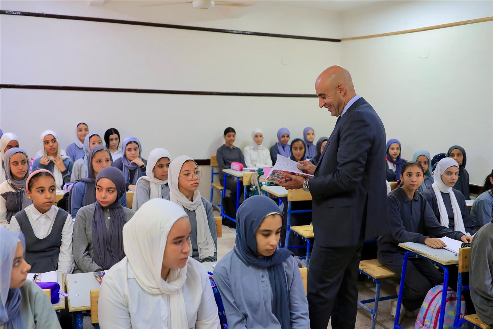 ثم توجه الوزير إلى مدرسة عمار بن ياسر الرسمية لغات التابعة لإدارة السنطة التعليمية، والتي تضم (١٢٠٠) طالب وطالبة، حيث حرص الوزير خلال الجولة على متابعة الكثافات الطلابية ونسب الحضور، والالتزام بتسليم الكتب الدراسية للطلاب، وأعمال الصيانة التي تمت بالمدرسة.