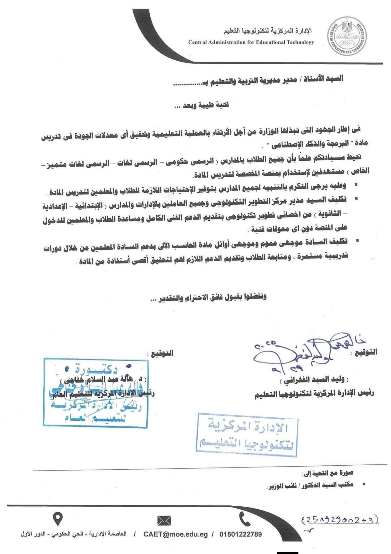 - تكليف مدير مركز التطوير التكنولوجي وجميع العاملين بالإدارات والمدارس ( الإبتدائية - الإعدادية