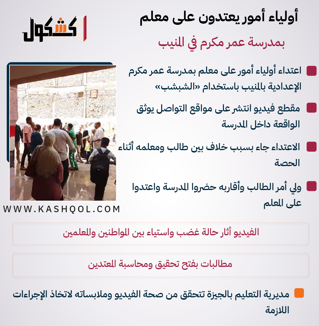 أولياء أمور يعتدون على معلم بمدرسة عمر مكرم في المنيب «انفوجراف»