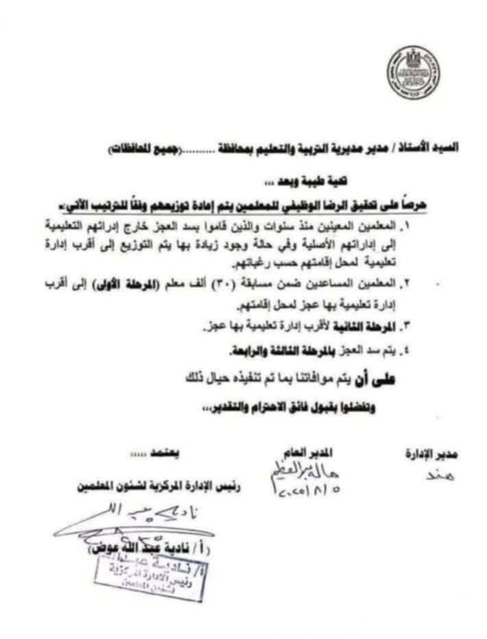 يأتي ذلك، حرصًا على تحقيق الرضا الوظيفي للمعلمين، مشيرة إلى أنه يتم إعادة توزيعهم وفقًا للترتيب الآتي: