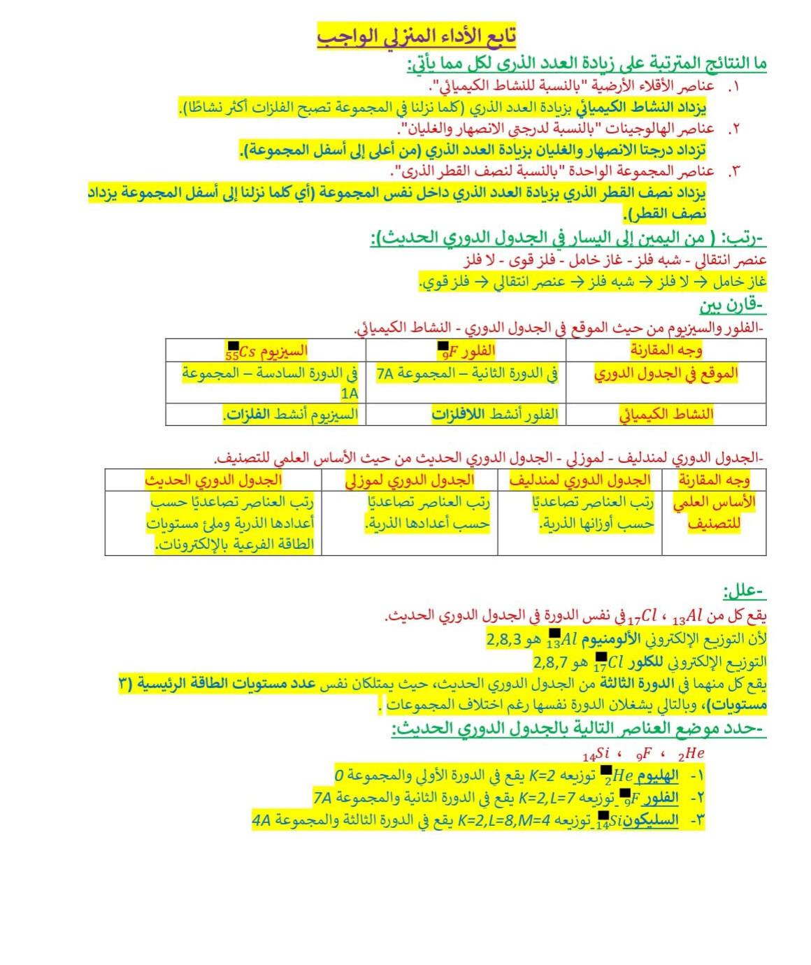 إجابة الأداء الصفي الثالث والربع كيمياء أولى اعدادي