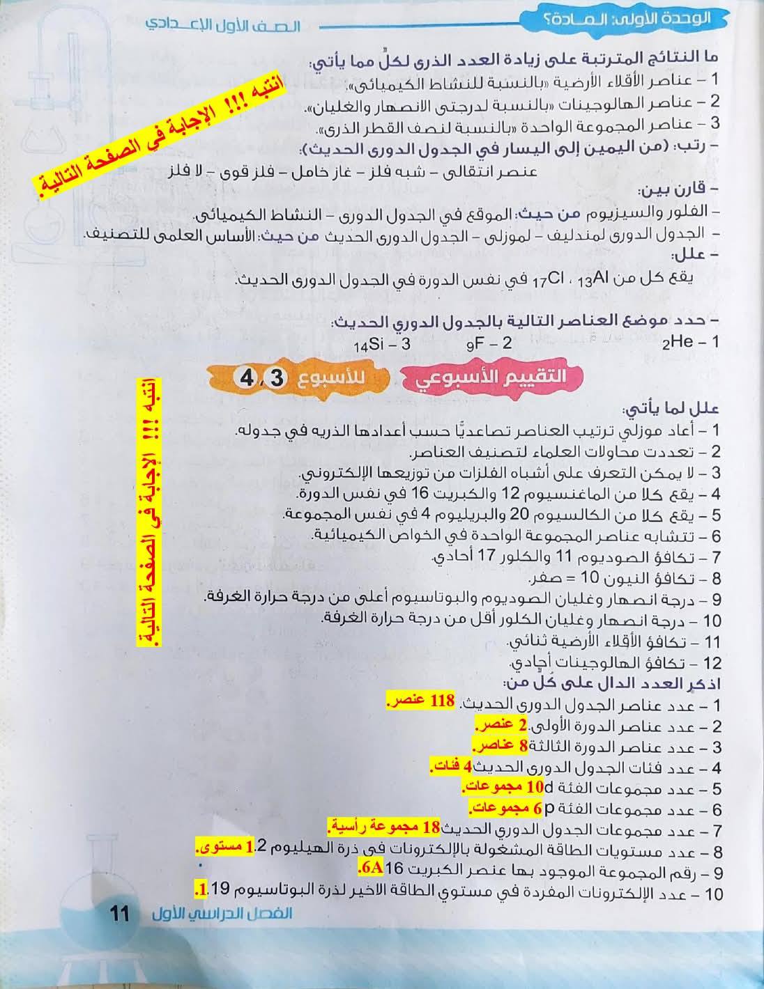 حل التقييم الأسبوعي الثالث والرابع كيمياء أولى اعدادي