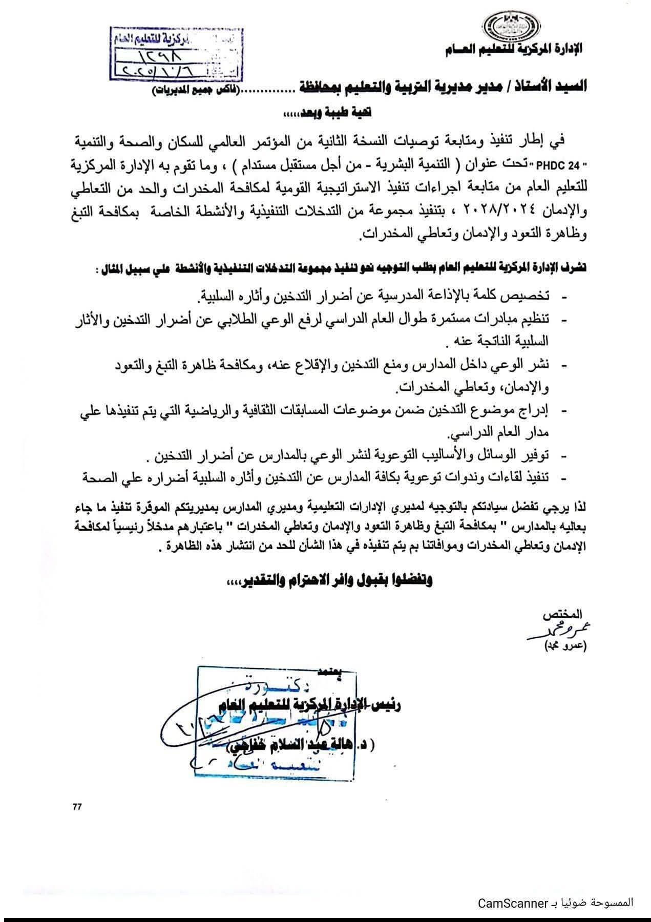 ووجهت مديري الإدارات التعليمية ومديري المدارس بـ تنفيذ ما جاء بعاليه بالمدارس " بمكافحة التبغ وظاهرة التعود والإدمان وتعاطي المخدرات " باعتبارهم مدخلًا رئيسيًا لمكافحة الإدمان وتعاطي المخدرات وموافاتنا بم يتم تنفيذه في هذا الشأن للحد من انتشار هذه الظاهرة.