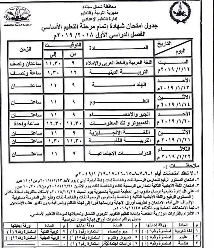 أعلنت مديرية التربية والتعليم بشمال سيناء جدول امتحان شهادة اتمام مرحلة التعليم الأساسي الفصل الدراسي الأول.