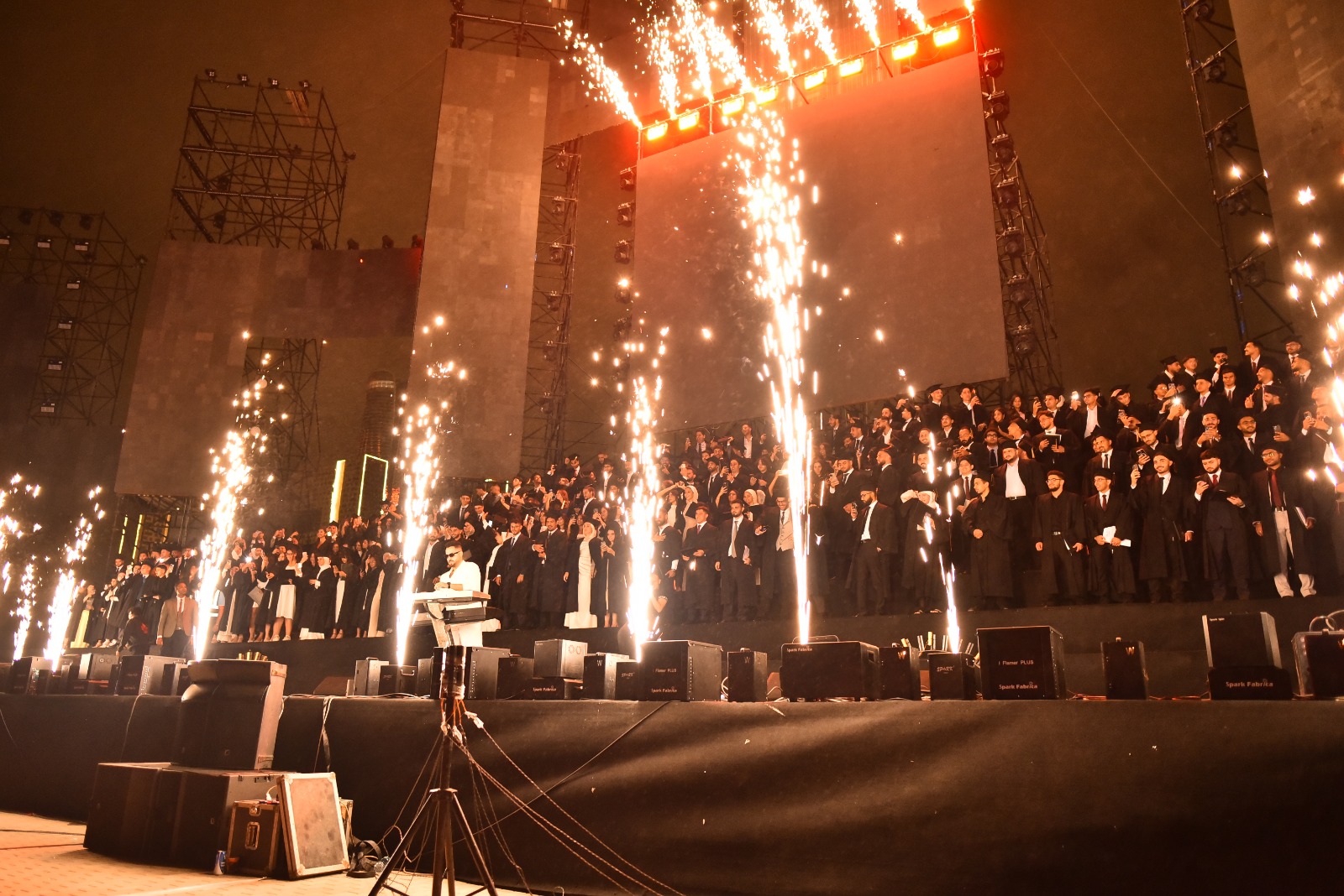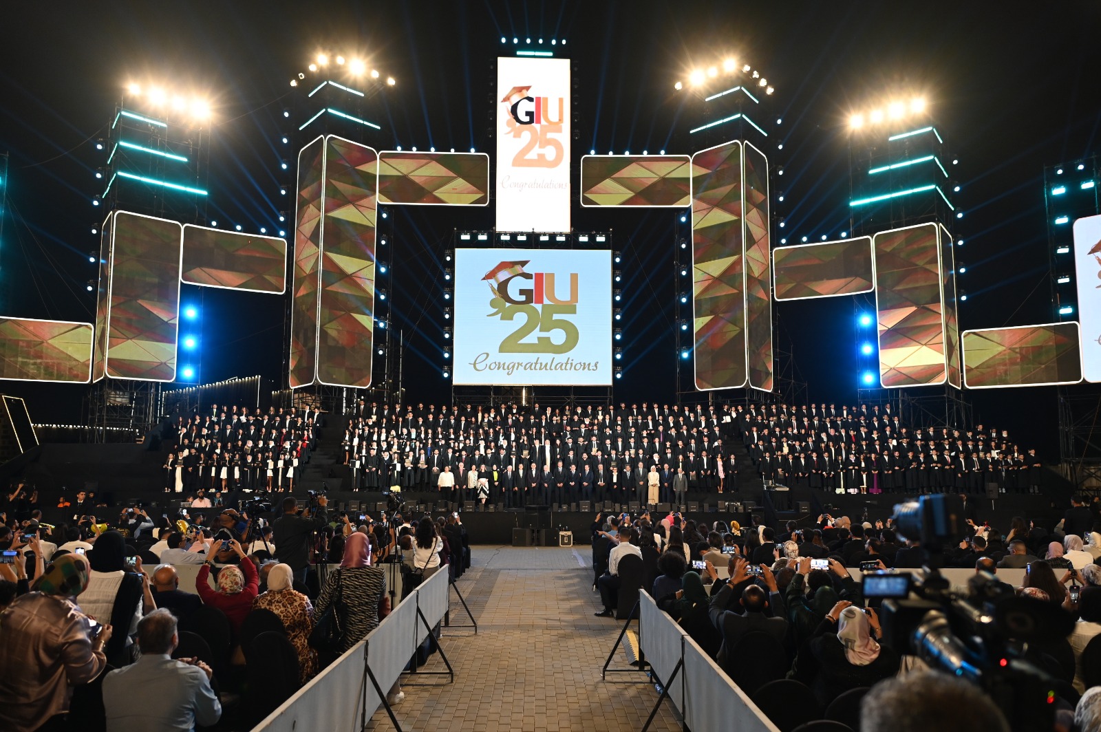 بدأت مراسم الاحتفالية بعزف السلام الجمهورى لمصر وألمانيا، أعقب ذلك كلمة من جانب الدكتورمنصور أشاد خلالها بالحضور وأعلن إطلاق تسمية هذه الدفعة من خريجي عام 2025 "سفراء الأمل والسلام"، مؤكدًا بأنه يشارك في هذه الاحتفالية العديد من الهيئات المصرية والألمانية والدولية لكونها تمثل نقطة فاصلة في حياة الخريجين، فهى تمثل لنا ولكم أيها الخريجين مستقبل واستقرار لأوطانكم ومجتمعاتكم في مصر وألمانيا والعالم بل تعد نقطة إرتكاز لتجربة فريدة تؤكد نجاح التعليم الألماني العالي في مصر العابر للحدود يستشعره الجميع في مصر وألمانيا، فنسبة الشهادات الألمانية الممنوحة لخريجي الجامعتين GUC وGIU تمثل ما يقرب من 60% من الشهادات الألمانية العابرة للحدود على مستوى دول العالم.