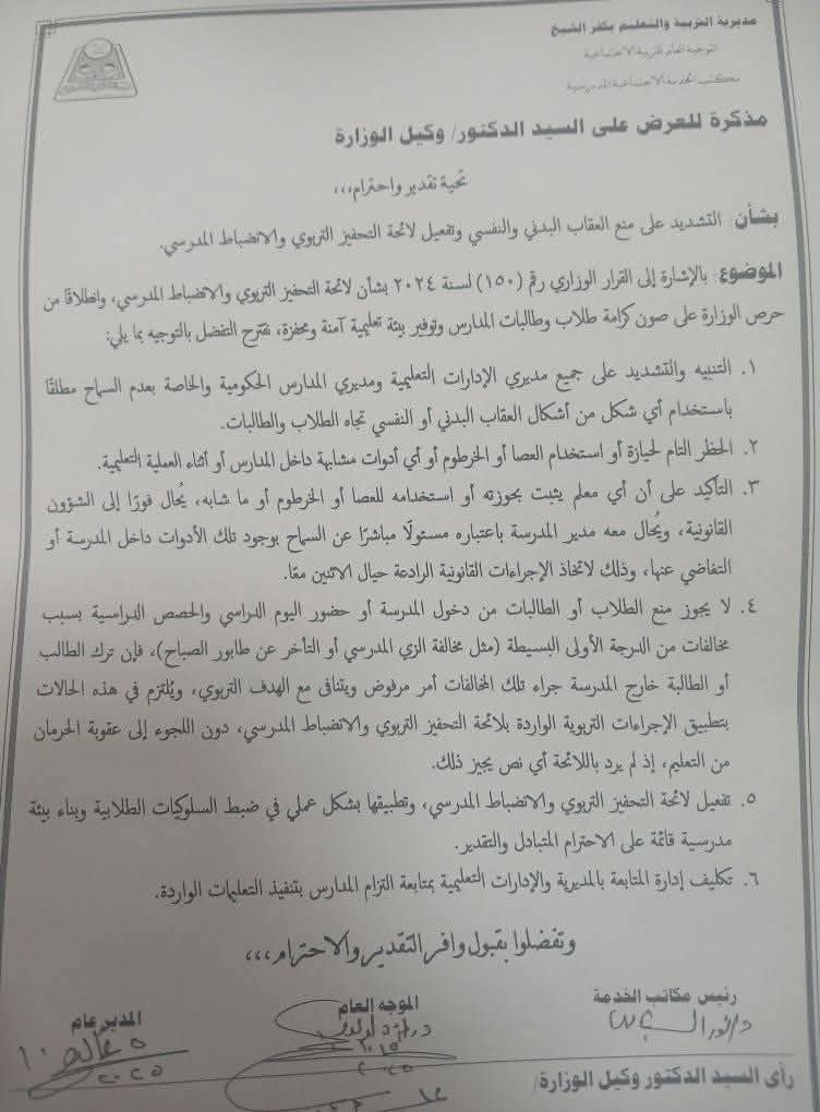 - التنبيه والتشديد على جميع مديري الإدارات التعليمية ومديري المدارس الحكومية والخاصة بعدم السماح مطلقًا باستخدام أي شكل من أشكال العقاب البدني أو النفسي تجاه الطلاب والطالبات.