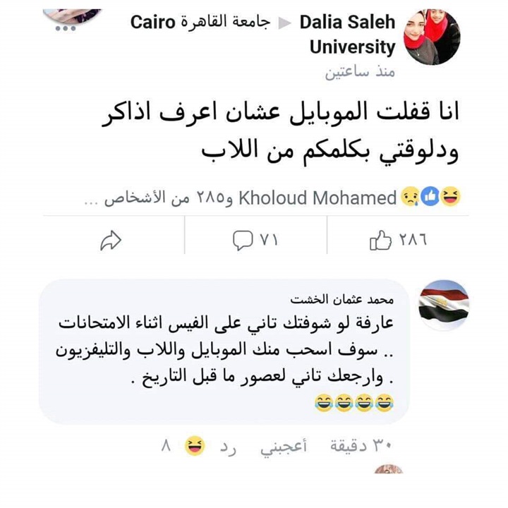 وقال الدكتور محمد عثمان الخشت، رئيس جامعة القاهرة، : "عارفة لو شوفتك تاني على الفيس أثناء الامتحانات سوف أسحب منك الموبيل واللاب والتليفزيون وارجعك لعصور ما قبل التاريخ"، وذلك ردًا على منشور لتلك الطالبة، والتي تدرس بكلية الحقوق، بإحدى جروبات الجامعة قائلة فيه: "قفلت الموبيل عشان أعرف أذاكر ودلوقتي بكلمكم من اللاب".