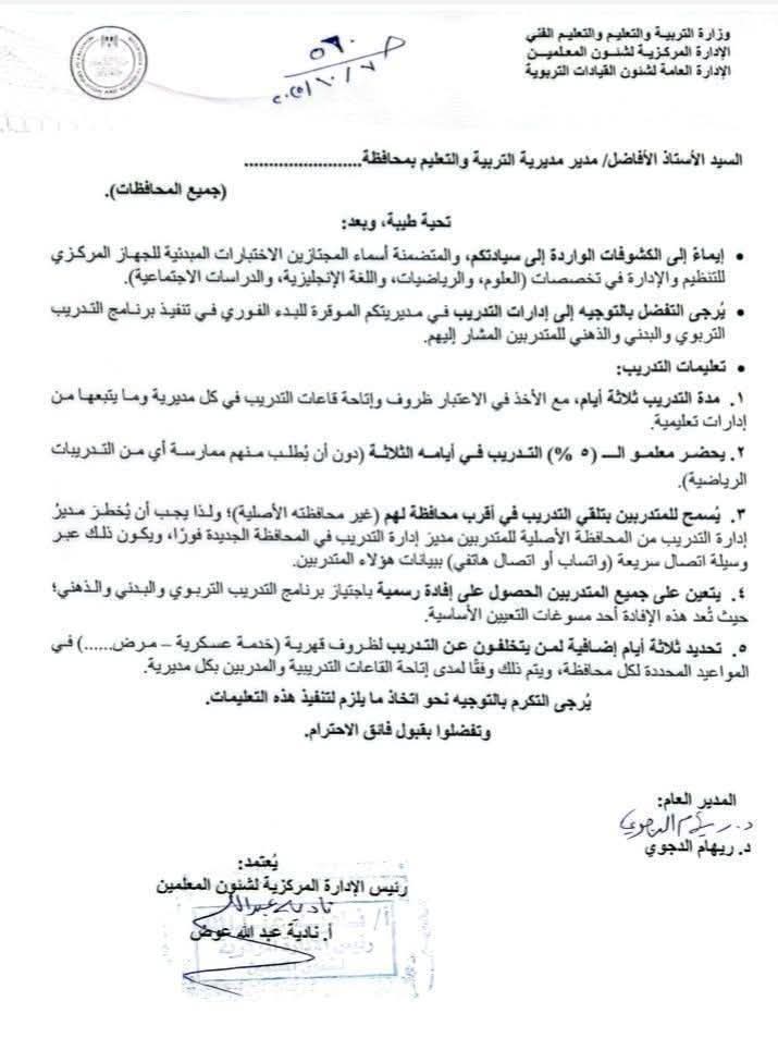وجهت وزارة التربية والتعليم والتعليم الفني، المديريات التعليمية بالبدء الفوري في تنفيذ برنامج التدريب التربوي والبدني والذهني للمتدربين الذين اجتازوا اختبار الجهاز المركزي للتنظيم والإدارة في مواد الرياضيات والعلوم والدراسات الإجتماعية واللغة الإنجليزية وفق التعليمات الآتية: