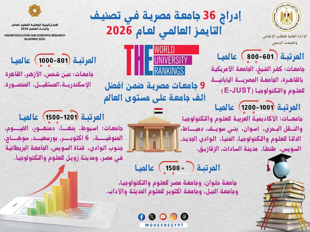 التعليم العالي: إدراج 36 جامعة مصرية في تصنيف التايمز العالمي لعام 2026