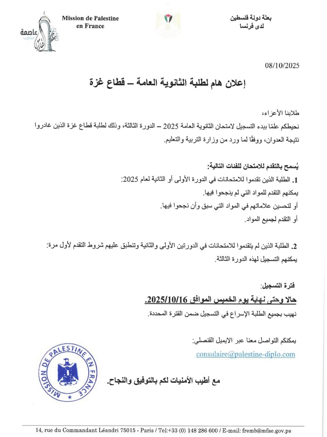 أعلنت بعثة دولة فلسطين في فرنسا، بدء التسجيل لامتحان الثانوية العامة 2025 - الدورة الثالثة، وذلك لطلبة قطاع غزة الذين غادروا نتيجة العدوان، ووفقًا لما ورد من وزارة التربية والتعليم.