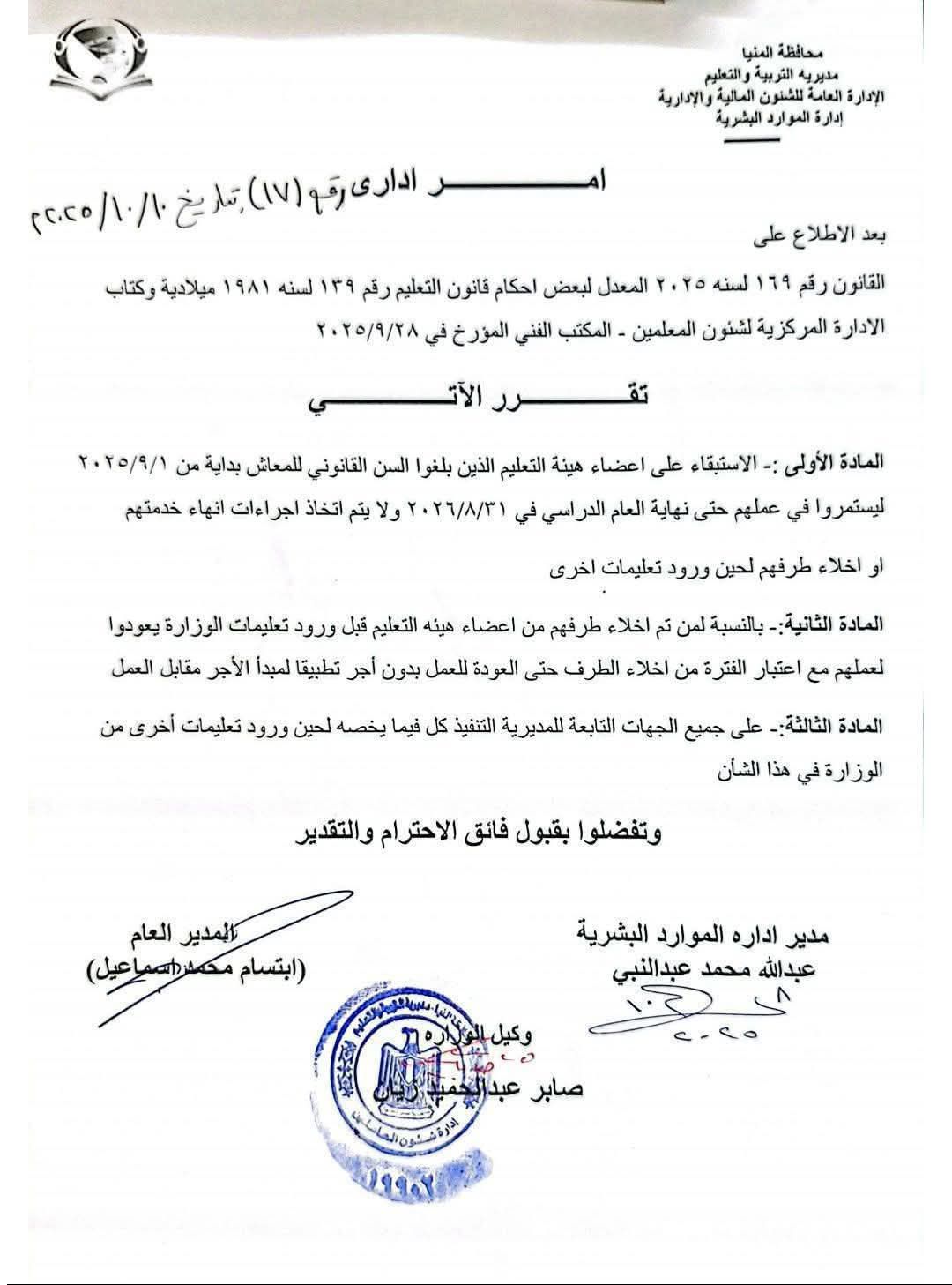 • الاستبقاء على اعضاء هيئة التعليم الذين بلغوا السن القانوني للمعاش بداية من ٢٠٢٥/٩/١ ليستمروا في عملهم حتى نهاية العام الدراسي في ۲۰۲٦/٨/٣١ ولا يتم اتخاذ اجراءات انهاء خدمتهم أو إخلاء طرفهم لحين ورود تعليمات اخرى
