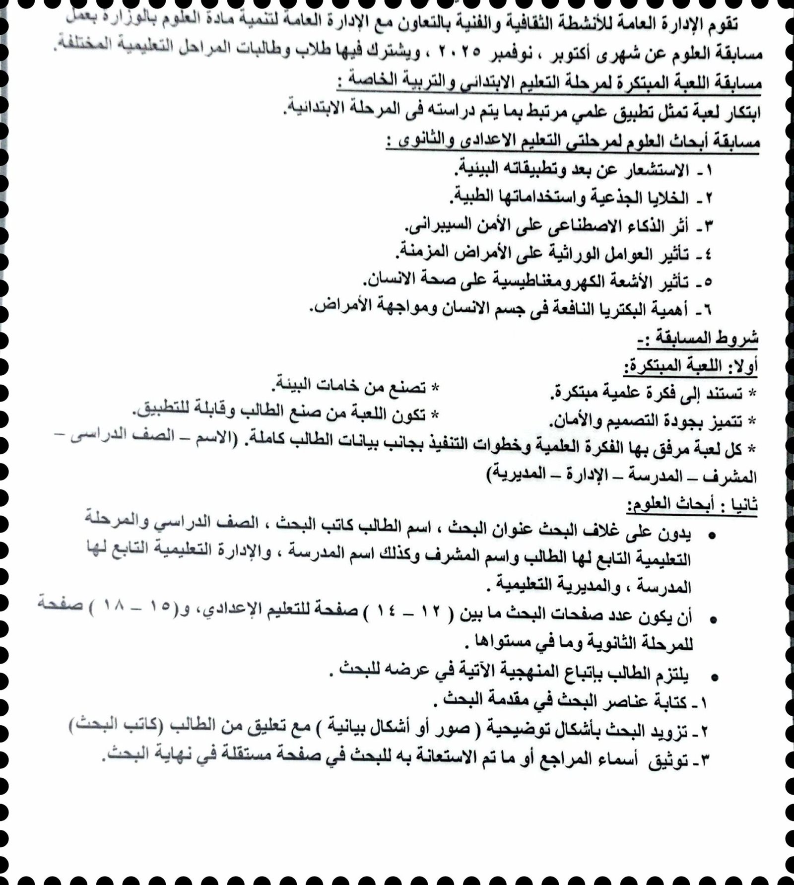 مسابقة أبحاث العلوم لمرحلتي التعليم الإعدادي والثانوي: