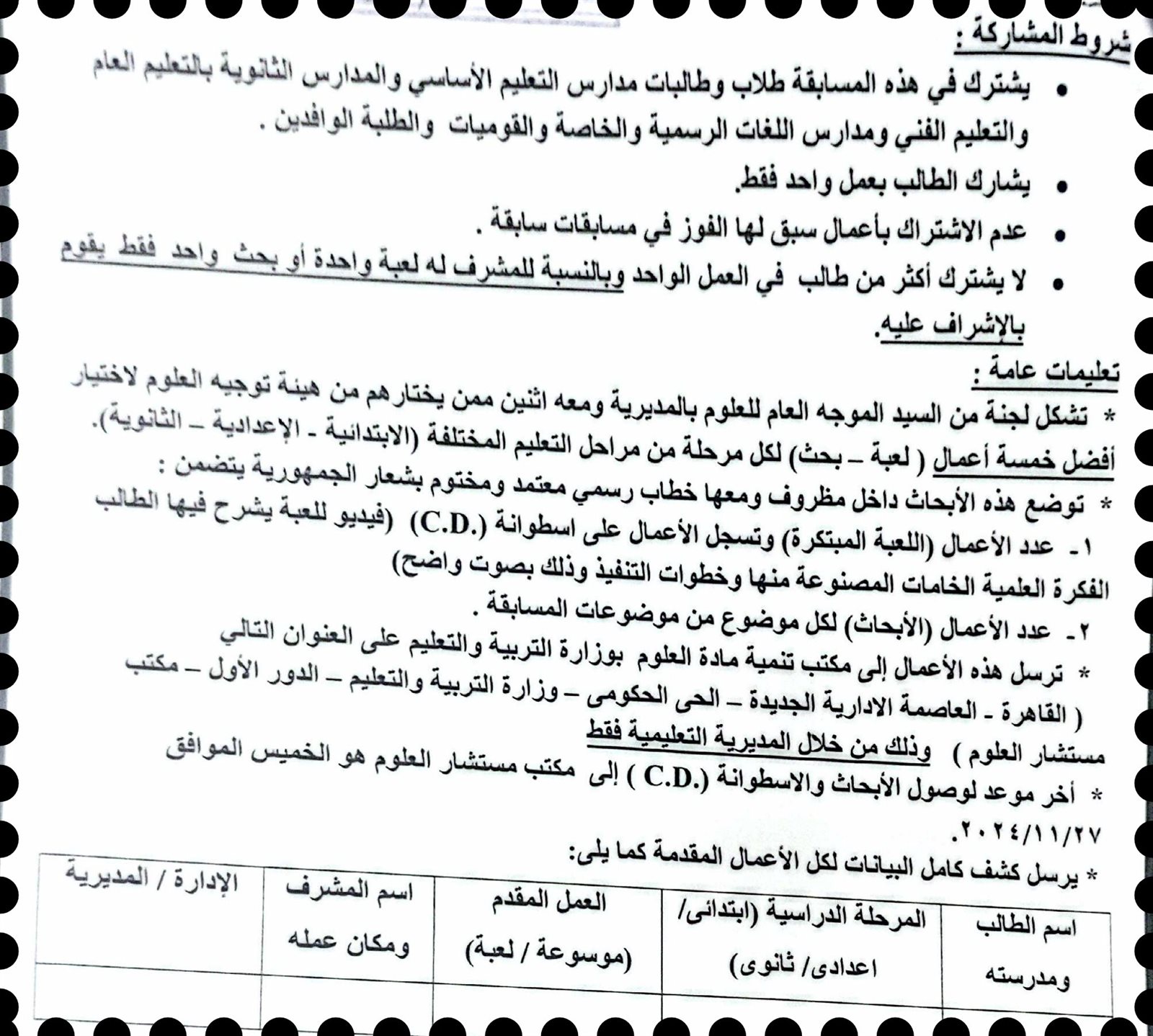 - أخر موعد لوصول الأبحاث والاسطوانة (.C.D ) إلى مكتب مستشار العلوم هو الخميس الموافق.٢٠٢٤/١١/٢٧