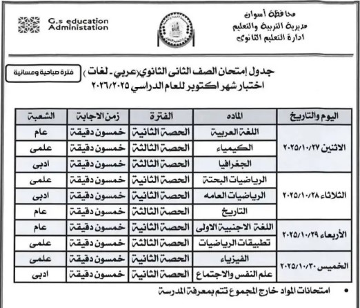 - جدول امتحانات شهر أكتوبر ثانية ثانوي محافظة أسوان 2026