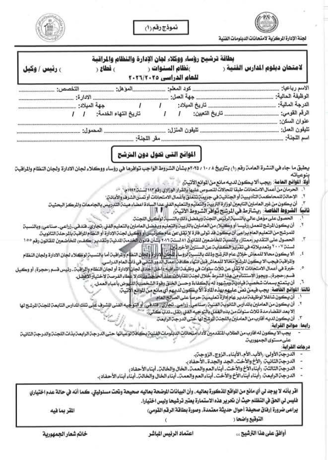 ووجهت كل من يجد في نفسه القدرة والكفاءة على القيام بالأعمال سالفة الذكر وتنطبق عليه الشروط الواردة بالإعلان التقدم عن طريق طبع استمارة الترشح  واعتمادها وإرفاق صحيفة أحوال حديثة وصورة بطاقة الرقم القومي وتقديمها لمديرية التربية والتعليم التابع لها اعتبارا من يوم الثلاثاء الموافق ۲۰۲۵/۱۰/۱٤ وحتى يوم الاثنين الموافق ۲۰۲۵/۱۰/۲۰.