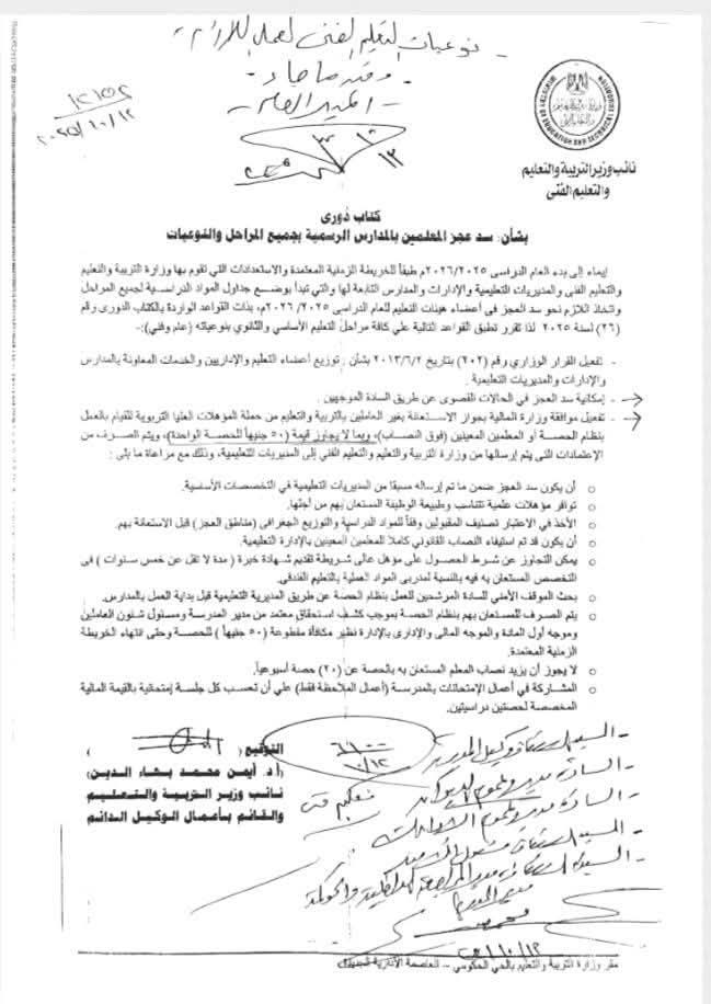 كشف خطاب وجهته وزارة التربية والتعليم والتعليم الفني، المديريات التعليمية عن خطتها لسد عجز المعلمين بالمدارس الرسمية بجميع المراحل والنوعيات بالعام الدراسي ٢٠٢٦/٢٠٢٥.