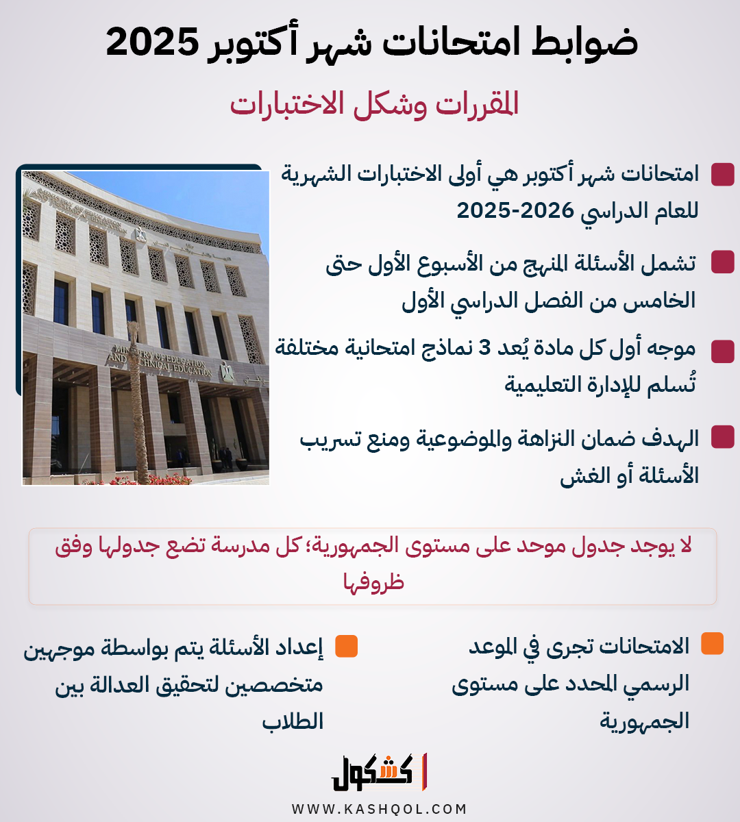 ضوابط امتحانات شهر أكتوبر 2025.. المقررات وشكل الاختبارات «انفوجراف»