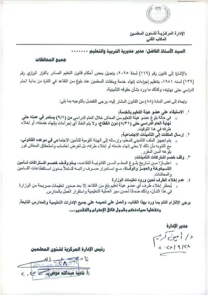 وأوضحت أنه بالإشارة إلى قانون رقم (١٦٩) لسنة ۲۰۲٥، بتعديل بعض أحكام قانون التعليم الصادر بالقرار الوزاري رقم (۱۳۹) لسنه ۱۹۸۱، بتنظيم إجراءات إنهاء خدمة وملفات المعلمين عند بلوغ سن التقاعد في الفترة من بداية العام الدراسي حتى نهايته، وكذلك ما ورد بشأن حقوقه التأمينية، وإيماء إلى نص المادة (۸۸) من القانون المشار إليه، يتم تنفيذ الآتي: