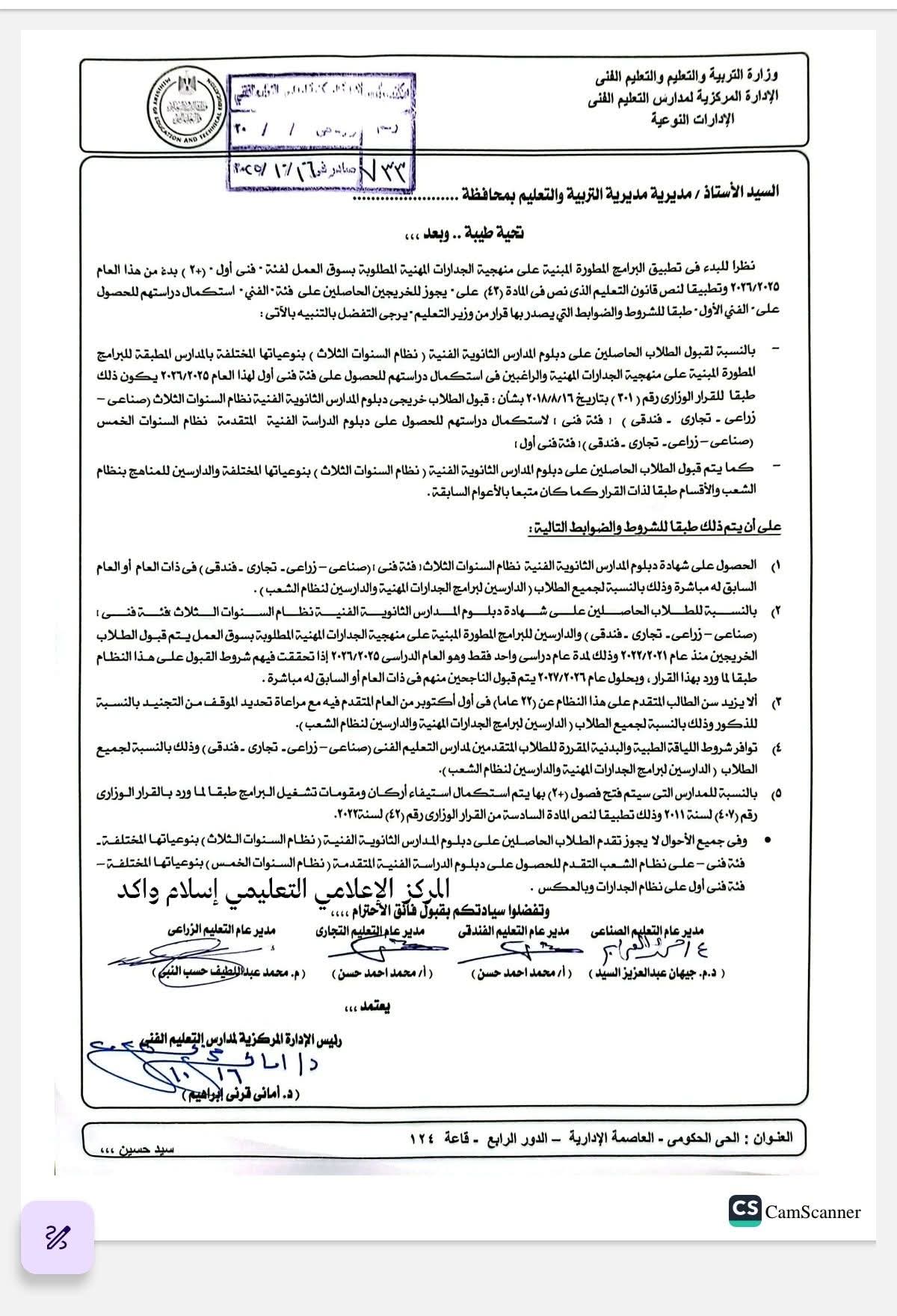 • بالنسبة لقبول الطلاب الحاصلين على دبلوم المدارس الثانوية الفنية ( نظام السنوات الثلاث ( بنوعياتها المختلفة بالمدارس المطبقة للبرامج المطورة المبنية على منهجية الجدارات المهنية والراغبين في استكمال دراستهم للحصول على فئة فنى أول لهذا العام ٢٠٣٦/٢٠٢٥ يكون ذلك طبقا للقرار الوزارى رقم ( ۲۰۱ ) بتاريخ ۲۰۱۸/۸/۱۶ بشأن: