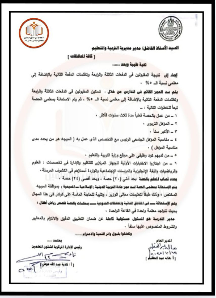 أوضحت وزارة التربية والتعليم والتعليم الفني، أنه إيماء إلى نتيجة المقبولين في الدفعات الثالثة والرابعة وتظلمات الدفعة الثانية بالإضافة إلى معلمى نسبة الـ 5% يتم سد العجز القائم في المدارس من خلال الآتي: