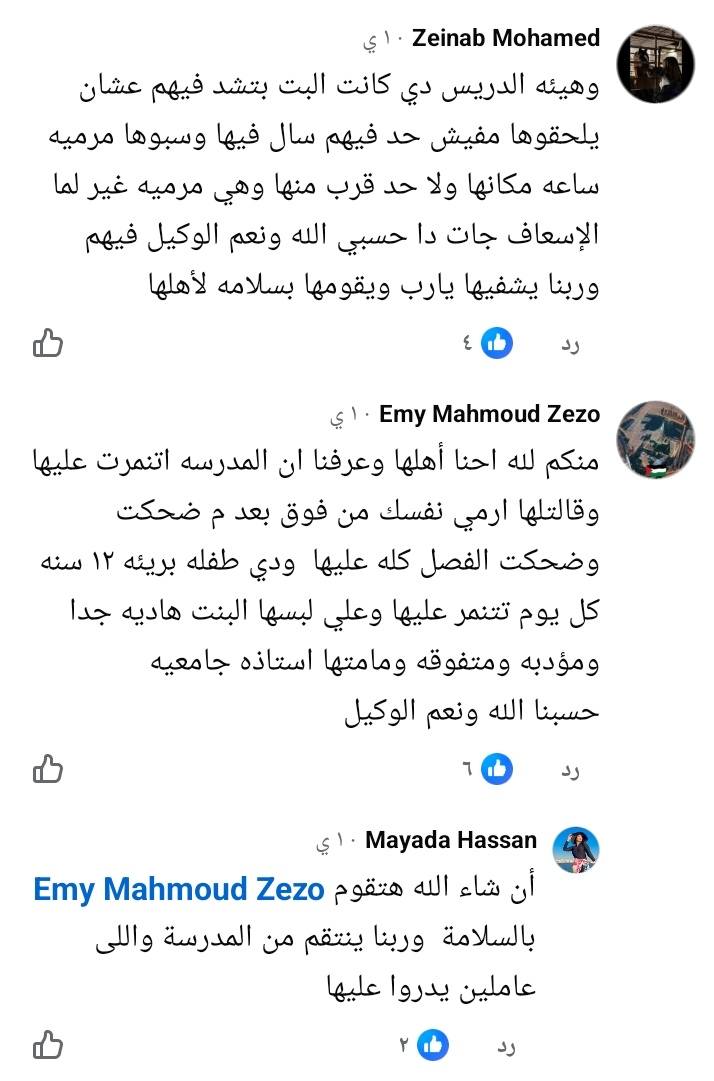 وعلقت إحدى أقارب الطفلة زينب على منشور شقيقها، بقولها: " نحن أهلهان وعرفنا أن المعلمة تنمرت عليها وقالت لها ارمي نفسك من فوق بعدما ضحكت عليها مع زملائها بالفصل".