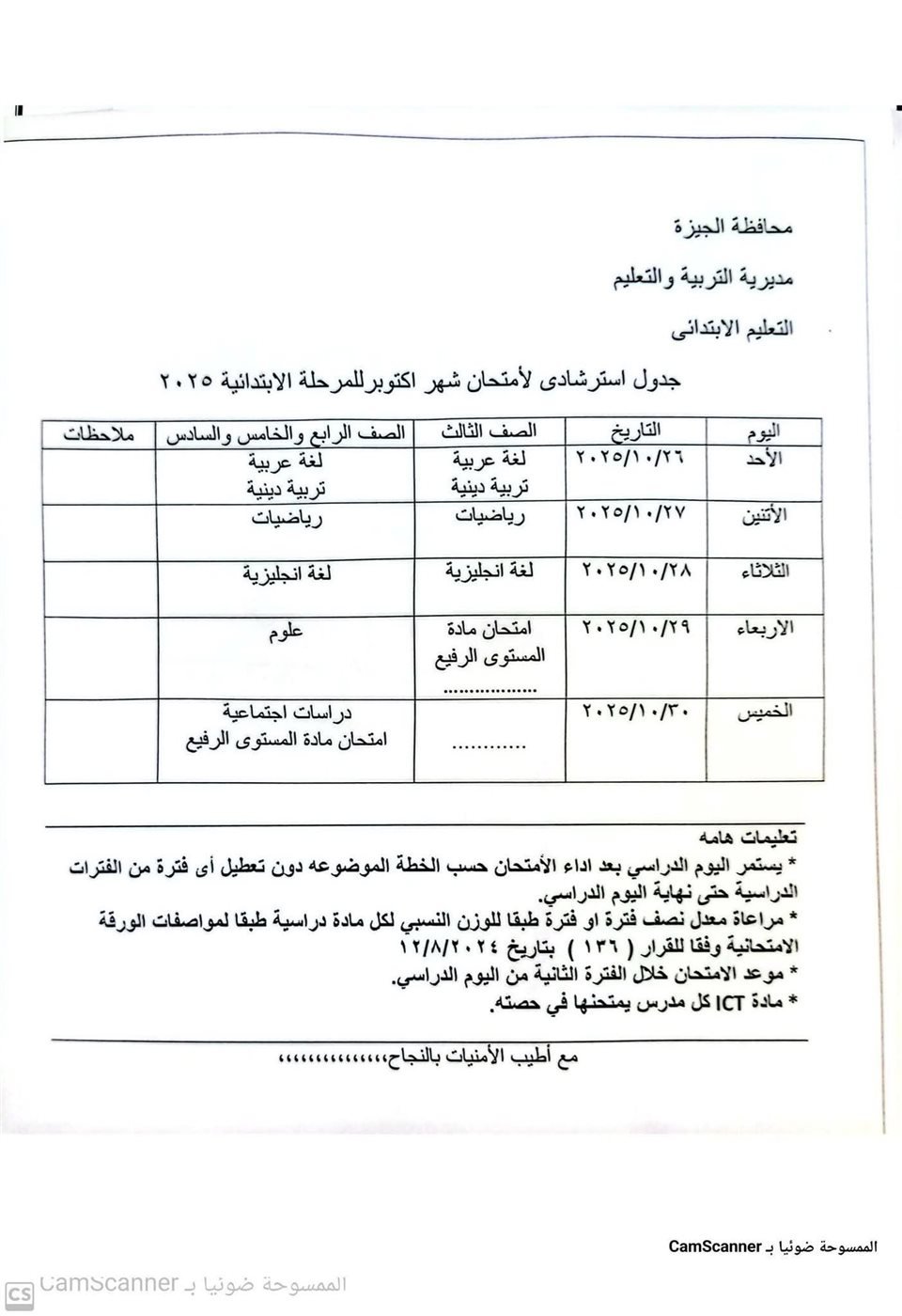 جدول امتحانات شهر أكتوبر خامسة ابتدائي 2025 الجيزة