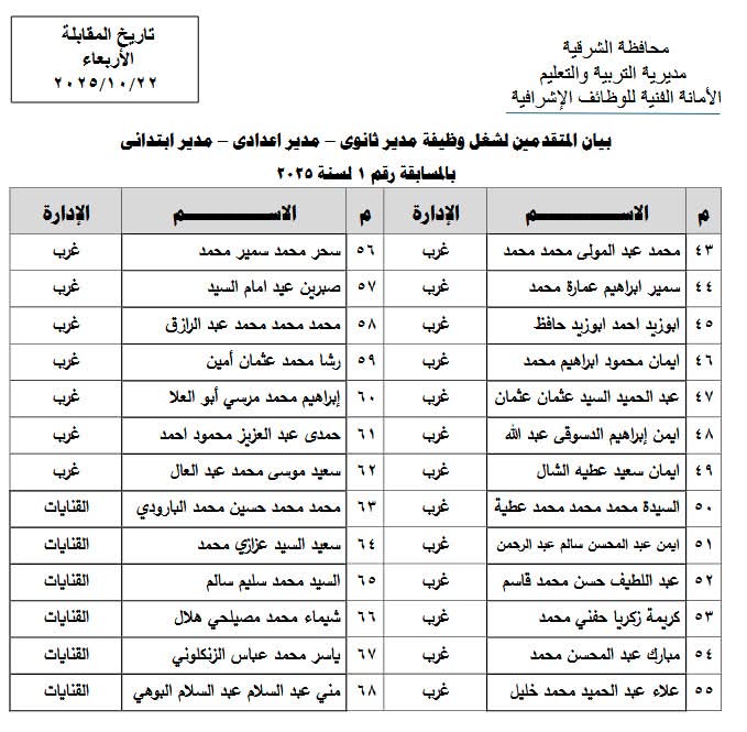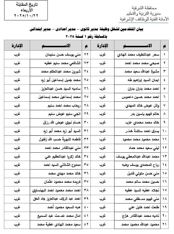 غدا.. انطلاق اختبارات المتقدمين لشغل وظيفة مدير مدرسة للابتدائية والإعدادية والثانوية بالشرقية