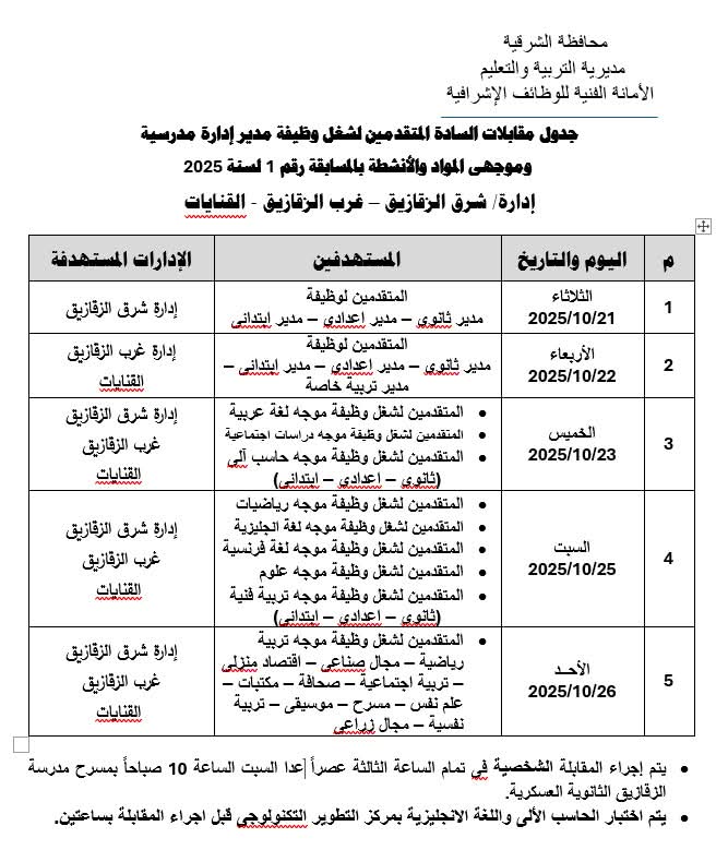 وأهابت مديرية التربية والتعليم بالشرقية، بالمتقدمين لشغل هذه الوظائف الحضور في المواعيد المحددة يوم الاربعاء 22 اكتوبر