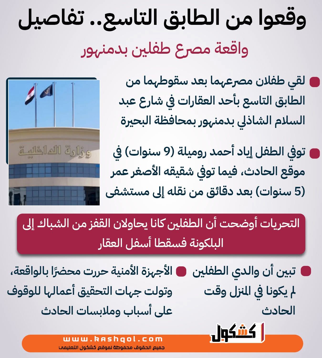 وقعوا من الطابق التاسع.. تفاصيل واقعة مصرع طفلين بدمنهور «انفوجراف»