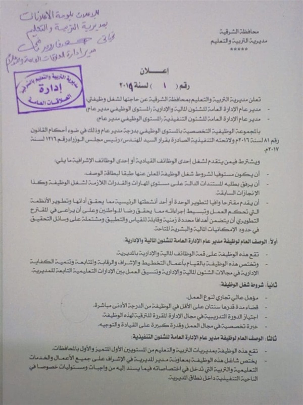 أعلنت مديرية التربية والتعليم بمحافظة الشرقية عن حاجتها لشغل وظيفتين، وهما مدير عام الإدارة العامة للشئون المالية والإدارية "المستوي الوظيفي مدير عام"، مدير عام الإدارة العامة للشئون التنفيذية.