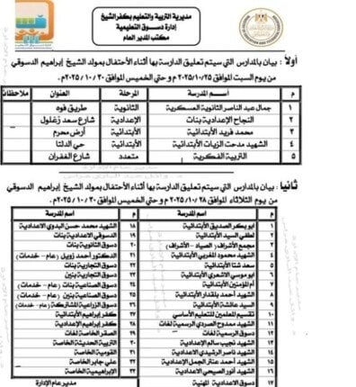وأوضح الدكتور علاء جودة، وكيل وزارة التربية والتعليم بكفر الشيخ، أن هذا القرار جاء بالتنسيق الكامل مع اللواء الدكتور علاء عبد المعطي، محافظ كفر الشيخ، وبتوصية من الأجهزة الأمنية والتنفيذية بمدينة دسوق، نظرًا للتوافد الكبير المتوقع للزائرين من مختلف المحافظات، وما يصاحبه من ازدحام داخل نطاق المدينة، لافتًا إلى أن الهدف من القرار هو تخفيف الكثافات المرورية وضمان سلامة الطلاب والمعلمين.