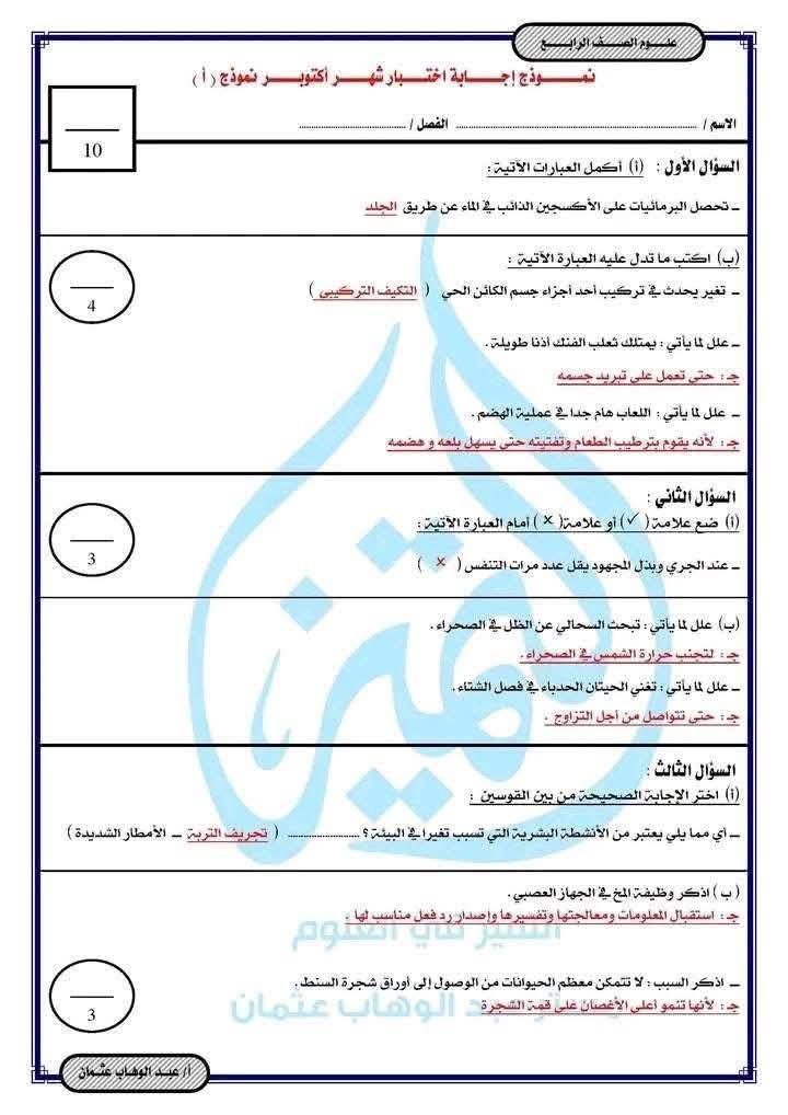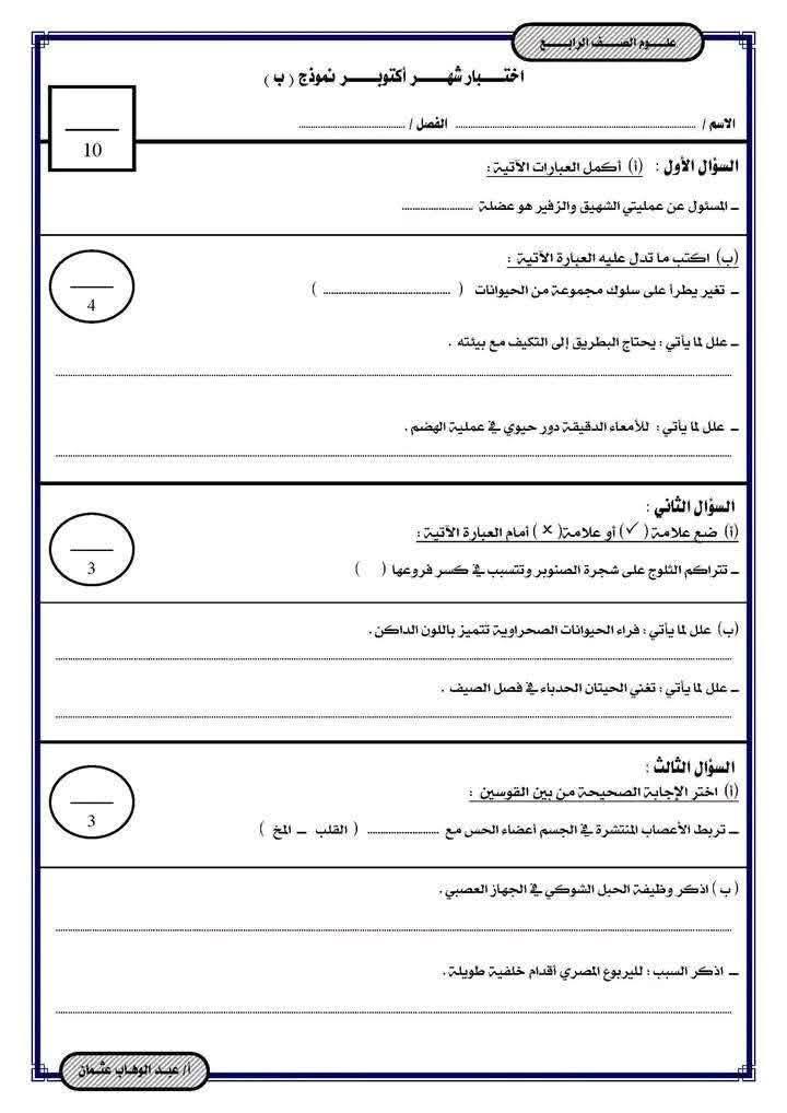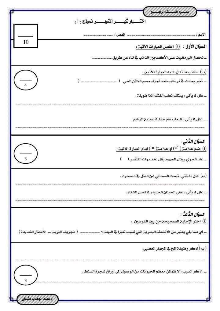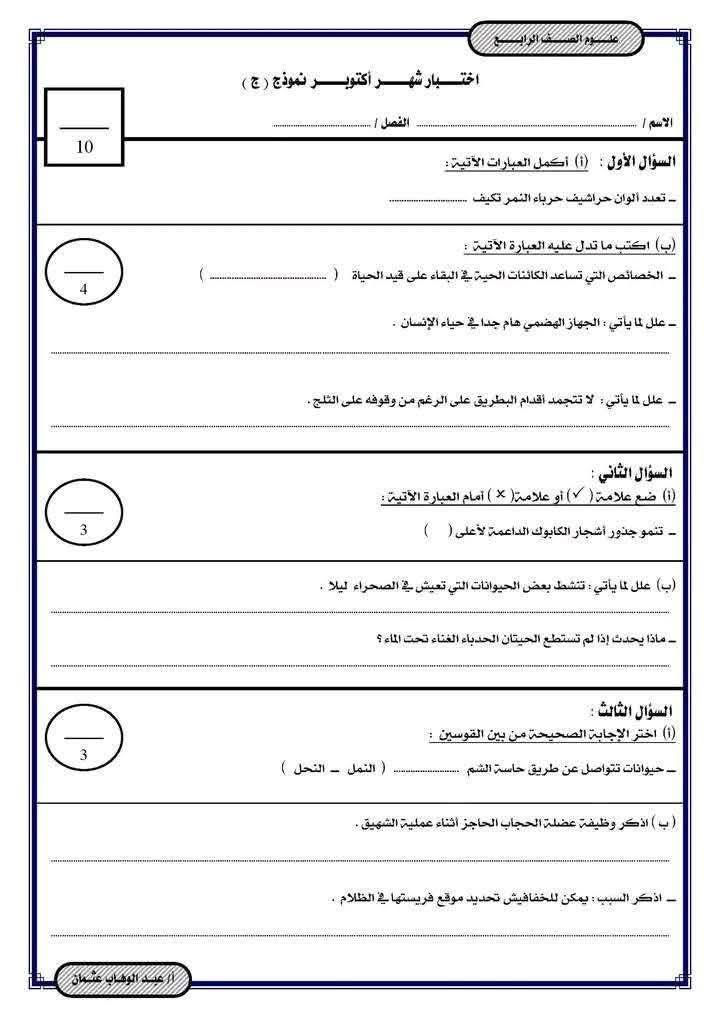 نماذج امتحانات شهر أكتوبر 2025 بمادة العلوم لـ الصف الرابع الابتدائي