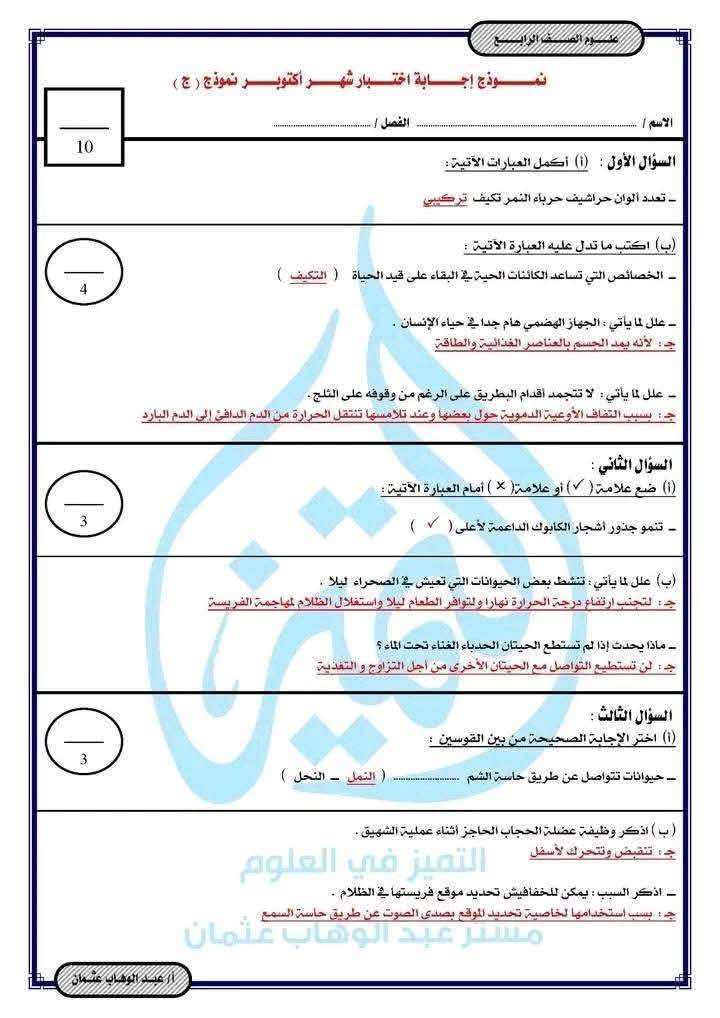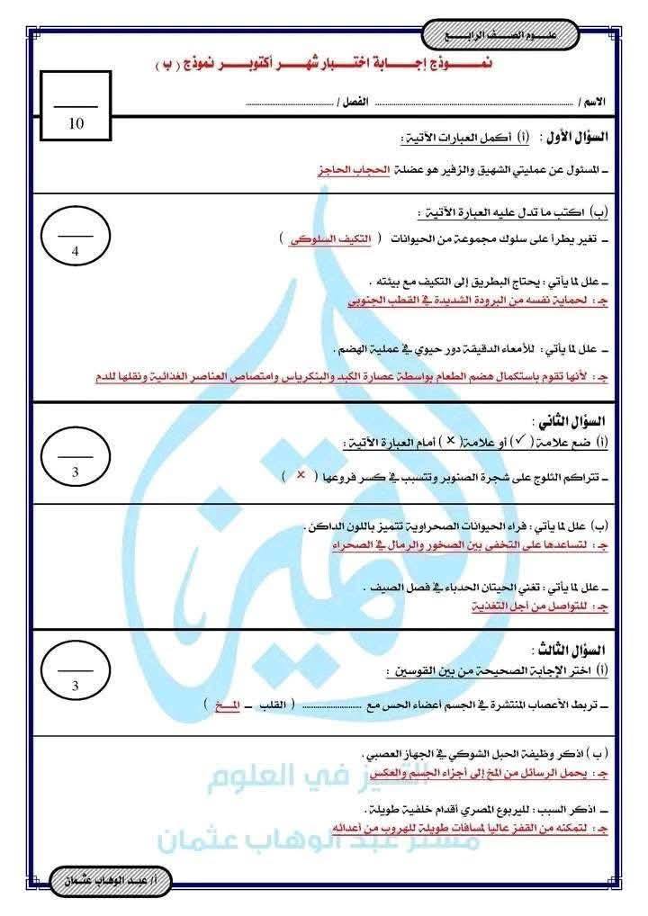 ويمكن الحصول على نماذج امتحانات شهر أكتوبر 2025 بمادة العلوم لـ الصف الرابع الابتدائي من خلال مطالعة الصور التالية: