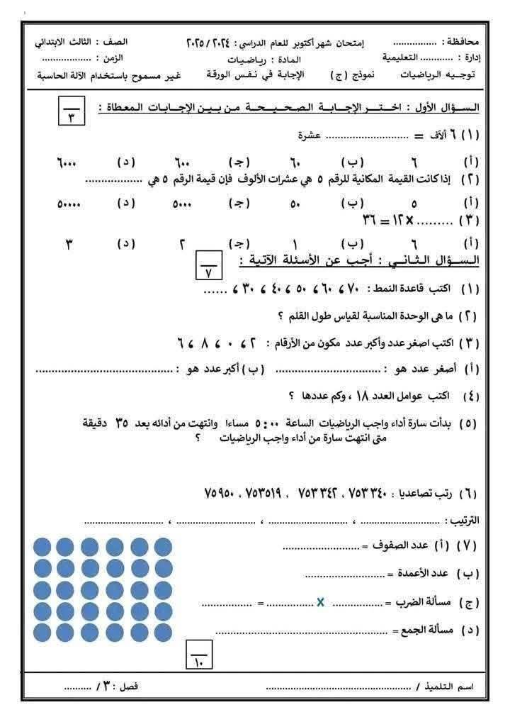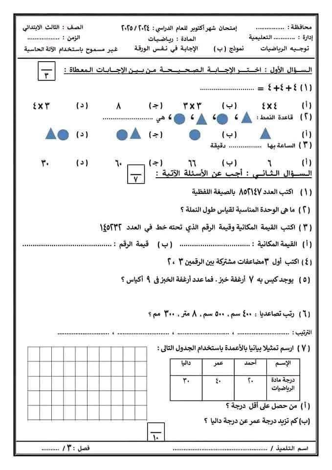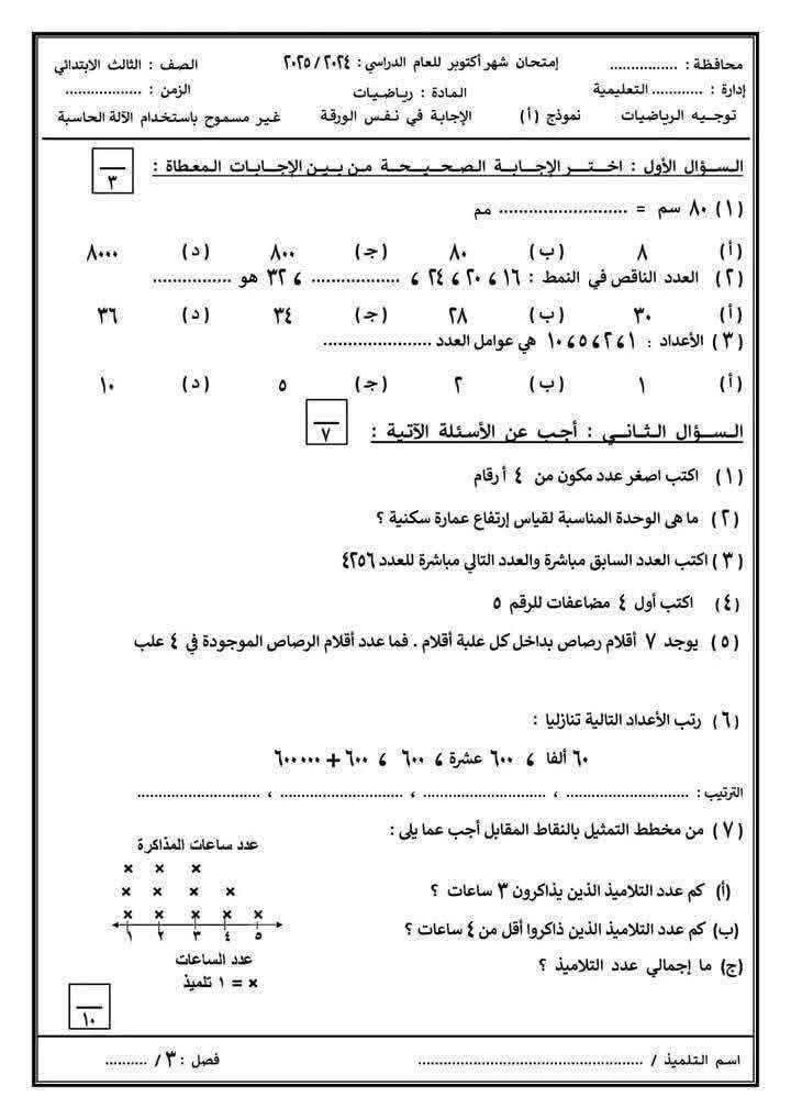 نماذج امتحانات شهر أكتوبر 2025 لطلاب الثالث الابتدائي بمادة الرياضيات