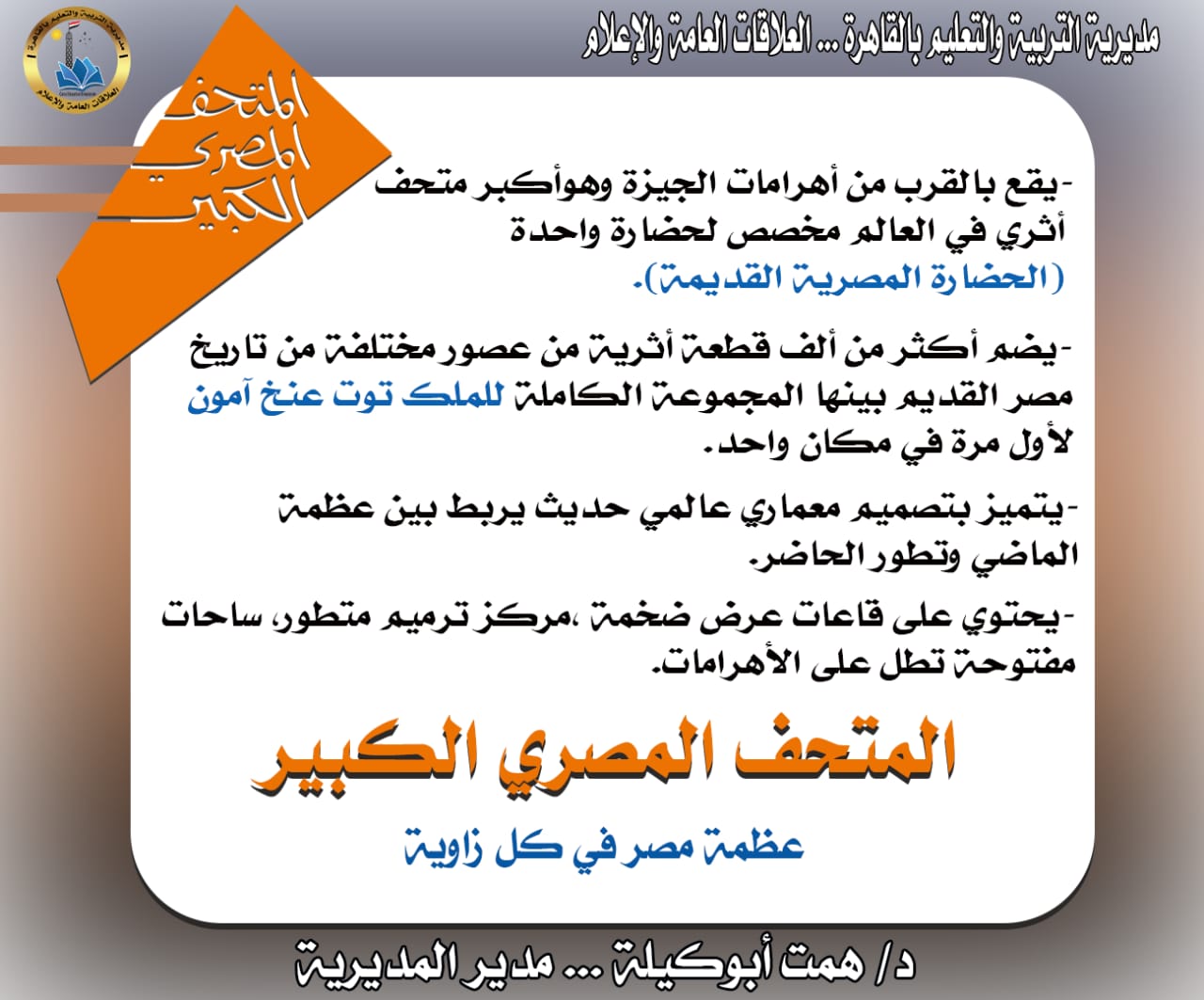 وجهت الدكتورة همت إسماعيل أبو كيلة مدير مديرية التربية والتعليم بالقاهرة، بتخصيص جزء من الإذاعة المدرسية في طابور الصباح بجميع مدارس العاصمة خلال الأيام القادمة، لتعريف الطلاب بـ المتحف المصري الكبير.
