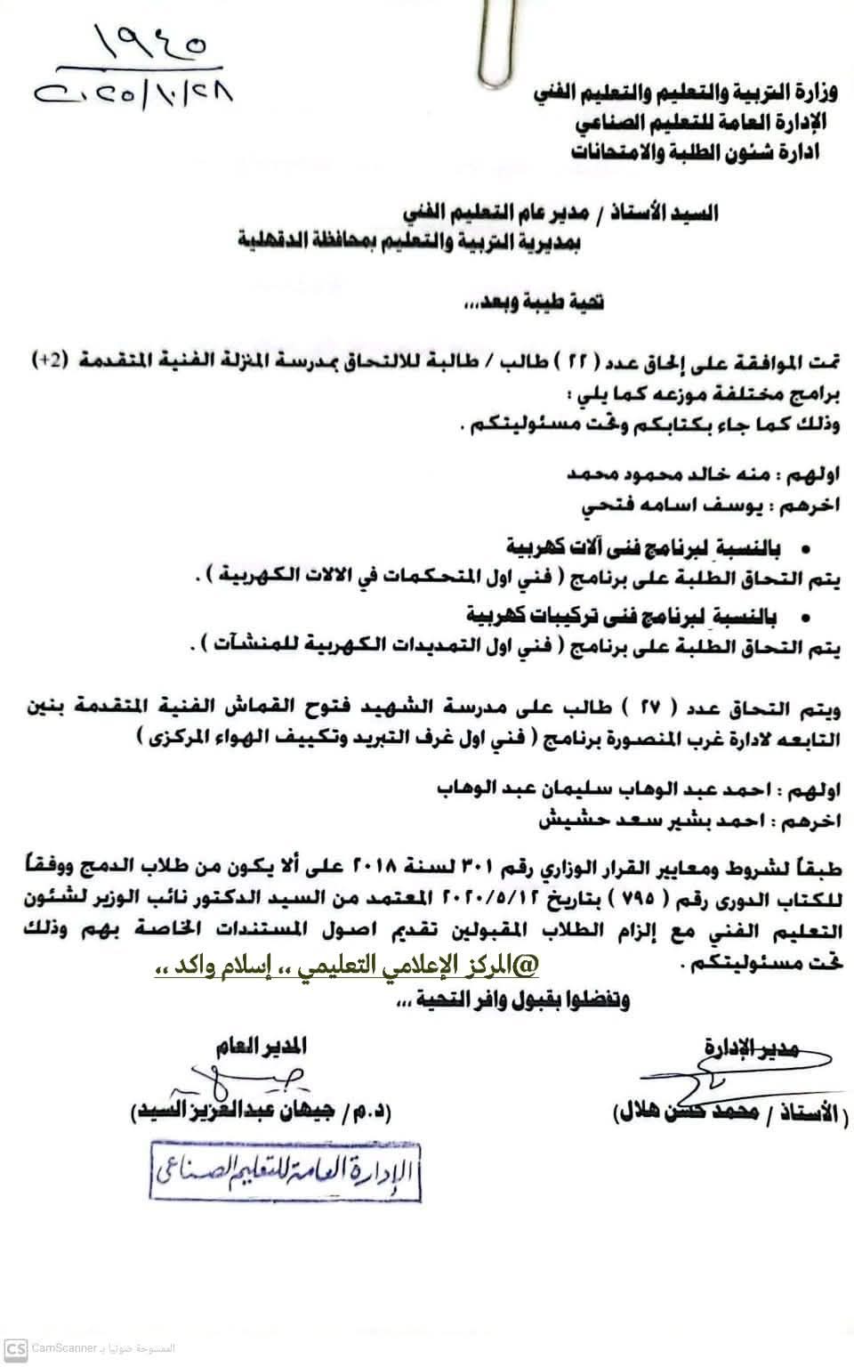 قررت وزارة التربية والتعليم والتعليم الفني الموافقة على إلحاق عدد ( ۲۲ ) طالب / طالبة للالتحاق بمدرسة المنزلة الفنية المتقدمة (2) برامج مختلفة موزعه كما يلي: