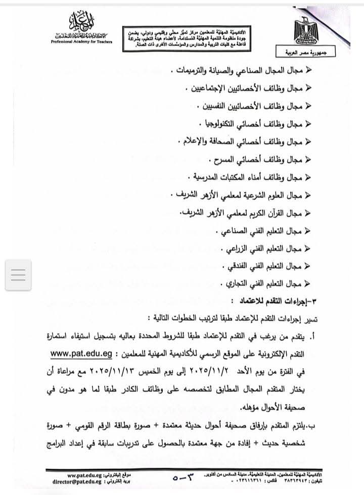 أ. يتقدم من يرغب في التقدم للإعتماد طبقا للشروط المحددة بعاليه بتسجيل استيفاء استمارة التقدم الإلكترونية على الموقع الرسمي للأكاديمية المهنية للمعلمين: www.pat.edu.eg في الفترة من يوم الأحد ۲۰۲۵/۱۱/۲ إلى يوم الخميس ٢٠٢٥/١١/۱۳ مع مراعاة أن يختار المتقدم المجال المطابق لتخصصه على وظائف الكادر طبقا لما هو مدون في صحيفة الأحوال مؤهله.