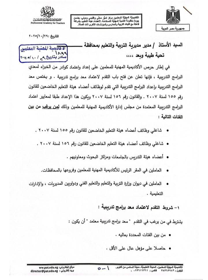 أعلنت الأكاديمية المهنية للمعلمين، عن فتح باب التقدم لاعتماد معد برامج تدريبية التي تقدم لوظائف أعضاء هيئة التعليم الخاضعين للقانون رقم ١٥٥ لسنة ۲۰۰۷ والقانون رقم ١٥٦ لسنة ۲۰۰۷.